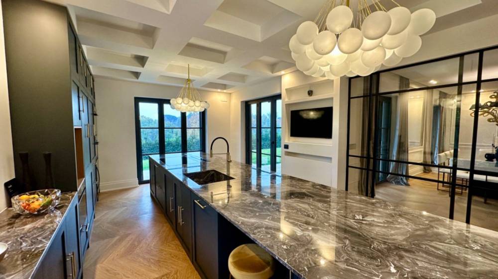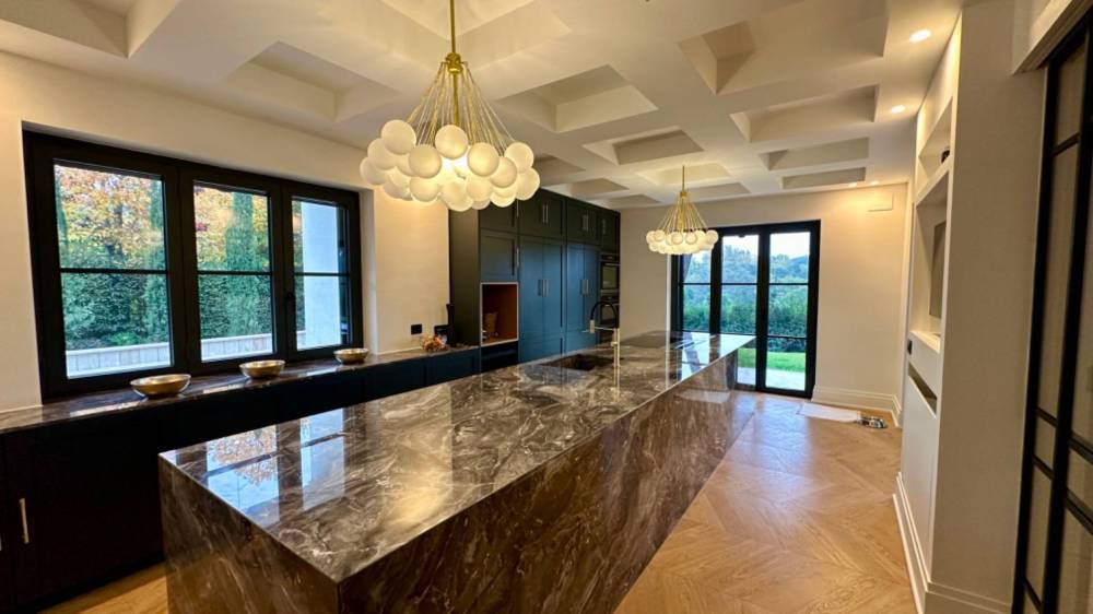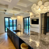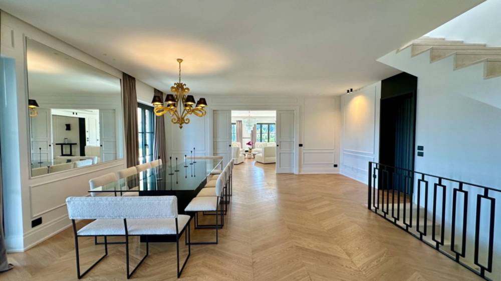 La sala da pranzo è spaziosa, progettata per accogliere un grande tavolo, perfetto per eventi di rappresentanza. A fianco della zona pranzo, una cucina di design realizzata artigianalmente, dotata di isola centrale in marmo orobico e attrezzata con elettrodomestici all'avanguardia, completa l'area living. Un pratico storage organizza gli spazi, rendendo l'ambiente funzionale e ordinato.
