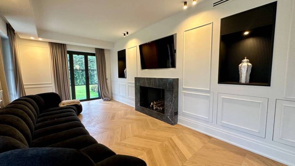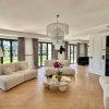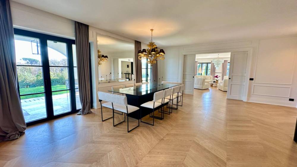 L'accesso alla proprietà avviene attraverso un elegante viale di cipressi, che conduce all'ingresso principale al piano terra. Qui, un ingresso accogliente ci introduce a un ampio salone suddiviso in diverse zone: soggiorno, area conversazione ed un ulteriore area living, arricchita da una parete attrezzata in boiserie con al centro un grande camino in marmo. L'ambiente è inondato di luce naturale grazie a ben sette porte finestre che si aprono sul patio, creando una continuità visiva con il parco e la piscina, offrendo una scenografia bucolica ideale per momenti di relax.