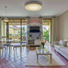 Ampio e luminoso soggiorno con affaccio su portico e giardino piantumato.