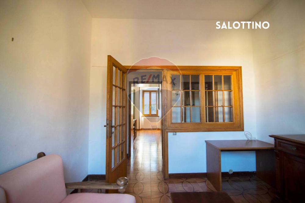 La palazzina si affaccia sul giardino pubblico con obelisco, palcoscenico delle cerimonie del paese; alle spalle, il campo da bocce e un grande parcheggio che ogni mercoledì diventa il mercato più frequentato. Gli alberi attorno schermano la circolazione: sei al centro delle cose, ma i rumori restano filtrati. Lappartamento è al primo piano, senza ascensore, con 87 m² ben distribuiti: cucina/tinello, salotto, corridoio, due camere e bagno. Il posto auto non è assegnato, ma nel cortile dietro casa si trova spazio con facilità: una rarità per il centro.