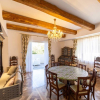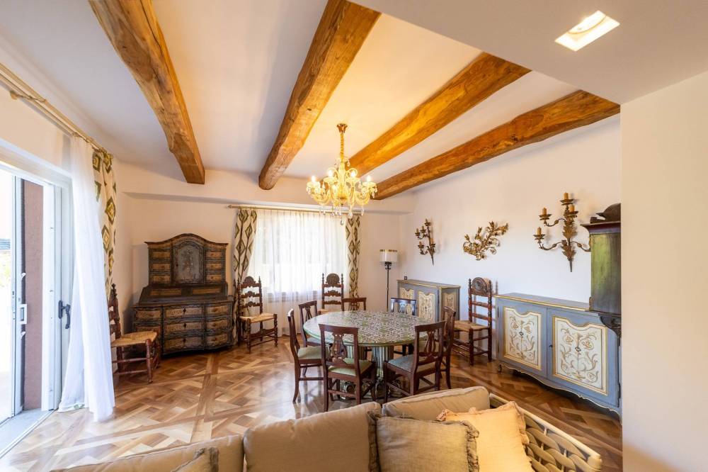 Il soggiorno accoglie con unatmosfera calda e raffinata, arricchita da travi in legno a vista, pavimenti in parquet decorato e arredi in stile classico toscano, con elementi artigianali e lampadari in cristallo. La cucina, moderna e funzionale, si integra perfettamente con lo stile elegante della casa.