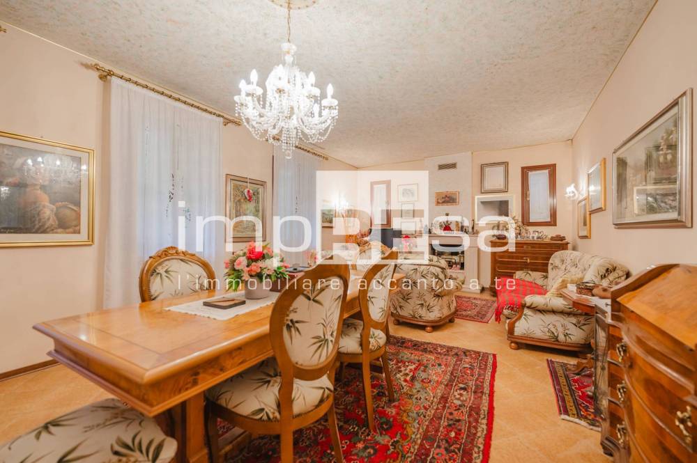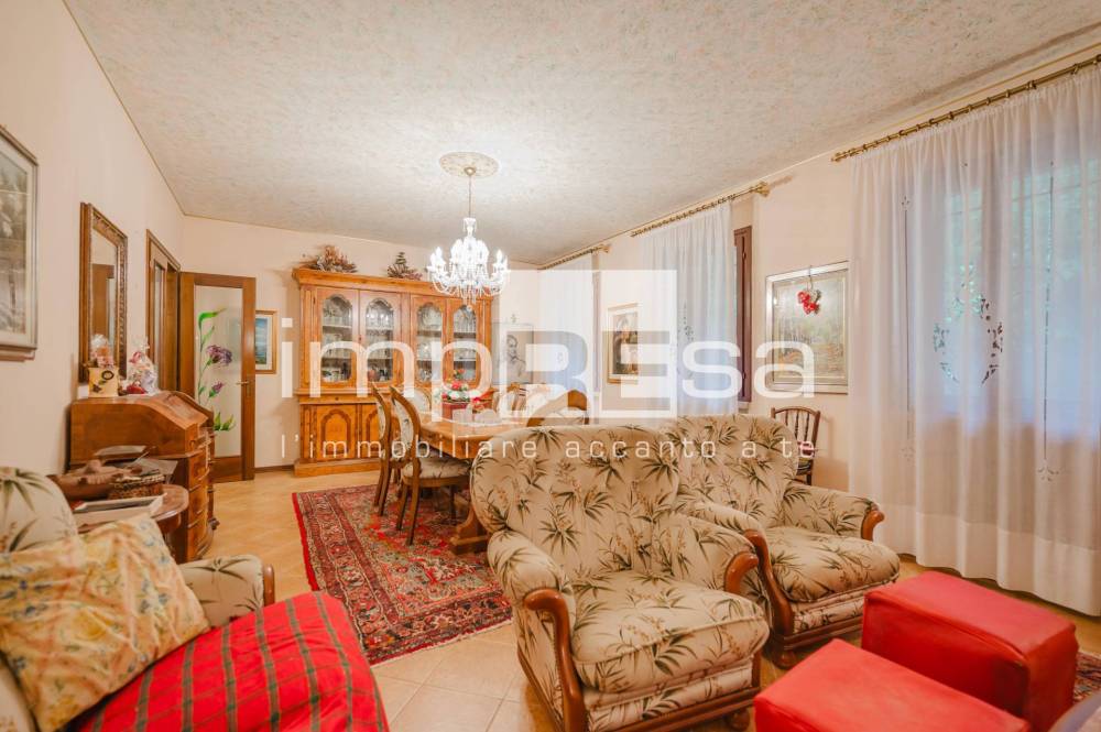 piano terra di mq. 160, composta da ingresso da porticato coperto esposto a Ovest, cucina con cucinotto separato, ampio salotto con caminetto in marmo, zona notte rialzata di 4 scalini, con matrimoniale, due camere doppie e una camera singola, più due bagni, uno con doccia e uno con vasca;