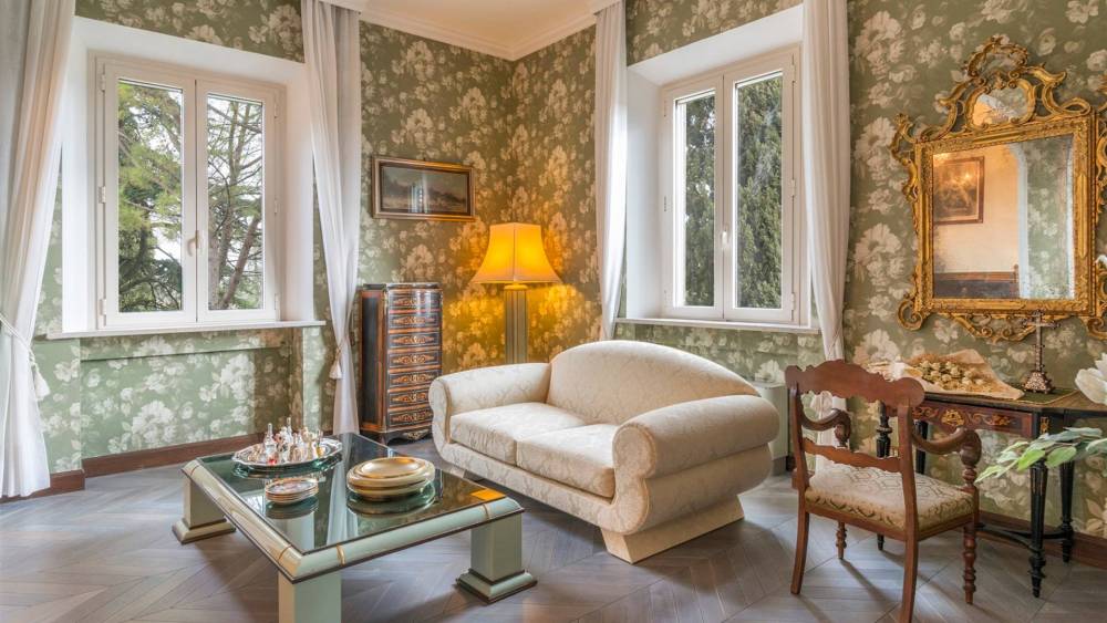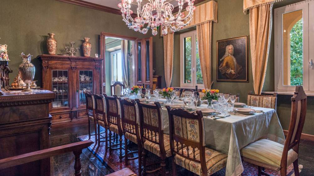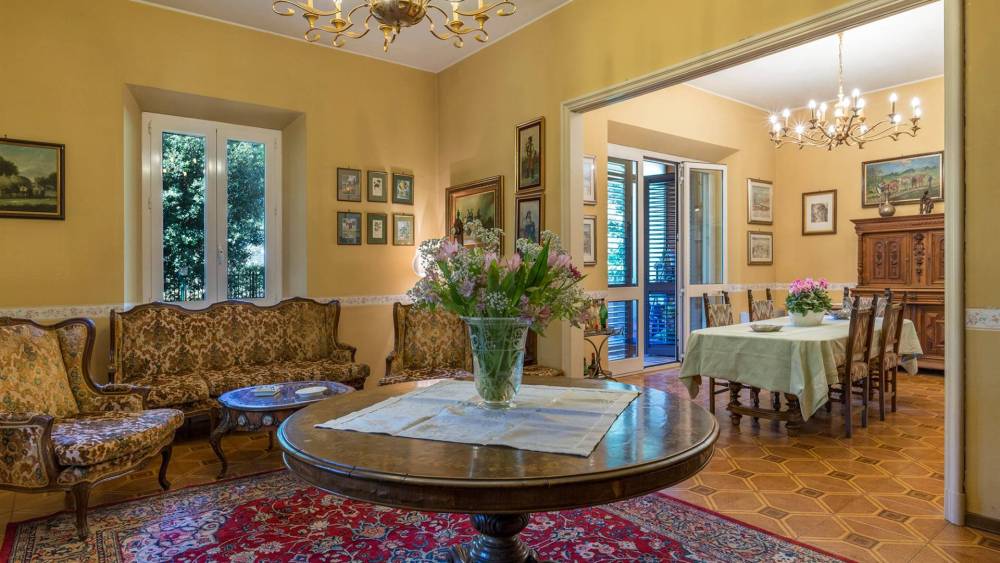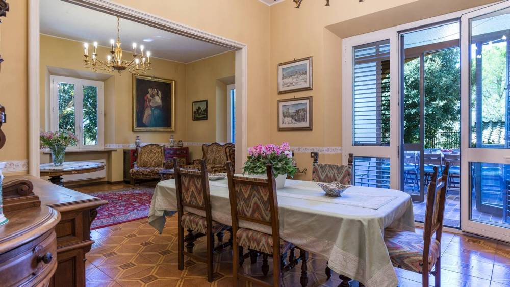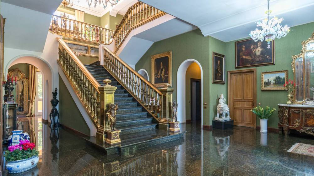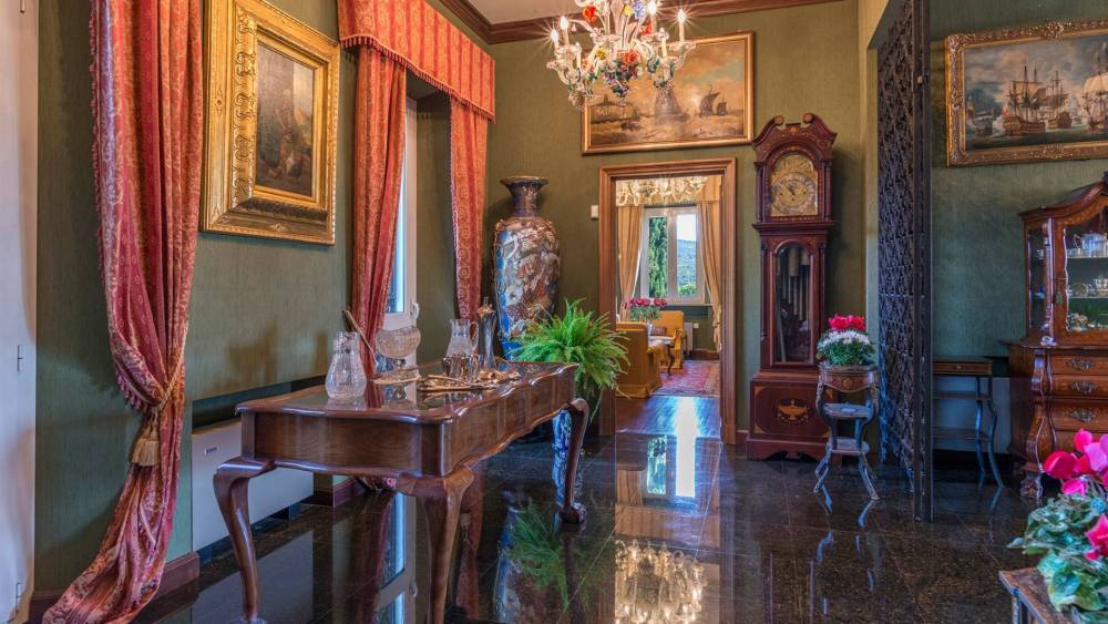 La villa, costruita negli anni 70 con grande attenzione alla qualità e al dettaglio, si presenta in ottime condizioni. Le sue atmosfere uniche sono esaltate da materiali pregiati e soluzioni architettoniche di grande fascino: pavimenti in marmo verde Ubatuba, una scenografica scala in marmo e ottone, imponenti lampadari in vetro di Murano e Boemia, affreschi e decorazioni dal sapore medievale e classico che donano allambiente uneleganza fuori dal tempo.