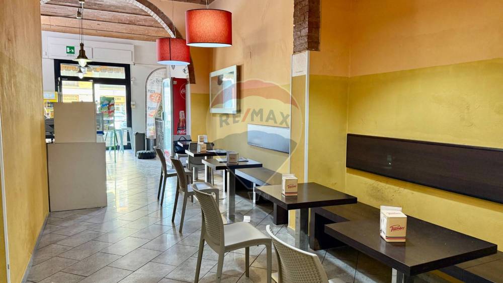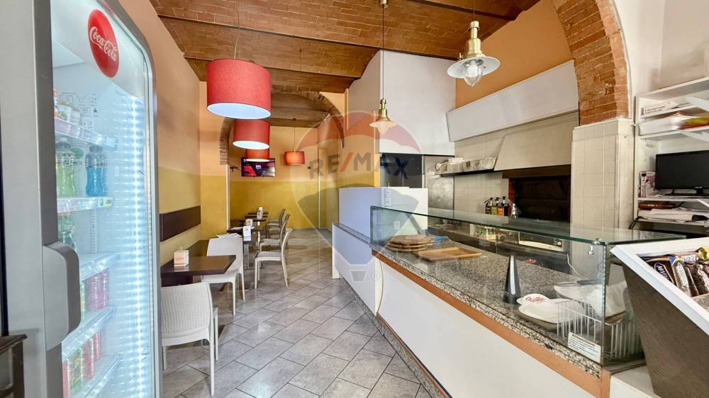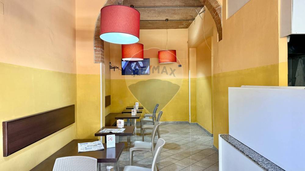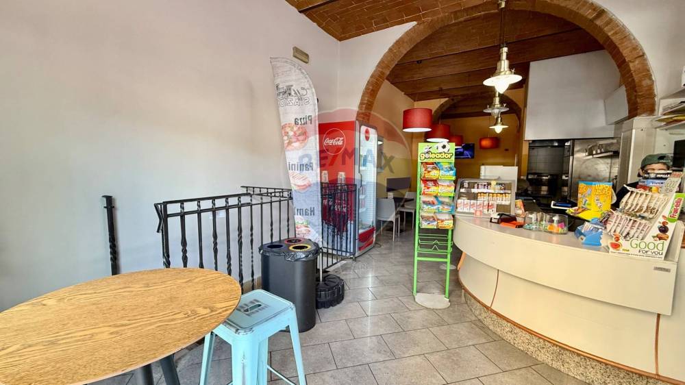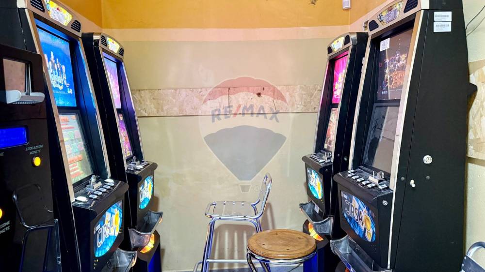 Lambiente interno si sviluppa su una superficie calpestabile di circa 105 mq al piano terra, così distribuiti: Lungo bancone bar attrezzato, bancone per gelati, forno elettrico per la preparazione di schiacciate, pizze al taglio e prodotti da forno, sala clienti con angolo slot dotato di 4 macchinette regolarmente autorizzate.