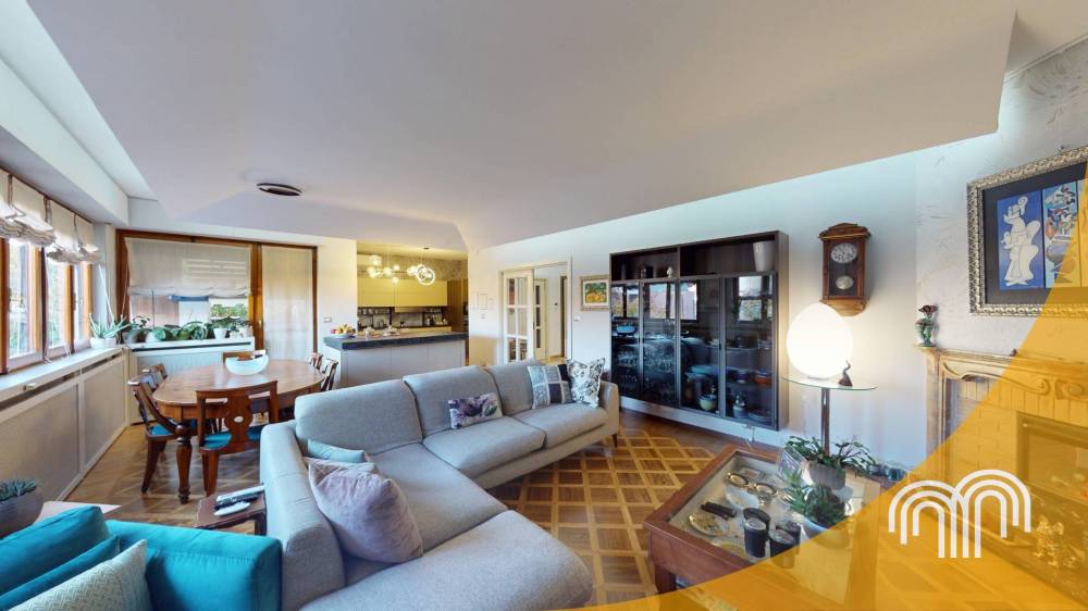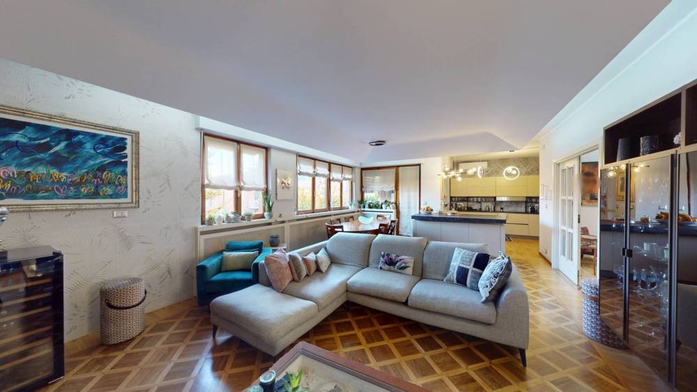 L'immobile, in ottime condizioni interne, è cosi composto: ingresso su disimpegno, ampia zona giorno con angolo cottura e doppia uscita sul balcone, seconda cucina abitabile, tre camere da letto di cui una dotata di bagno en suite con rivestimento in marmo di Carrara, tre bagni, tutti con finestra, ripostiglio e cabina armadio con accesso da una delle camere da letto.