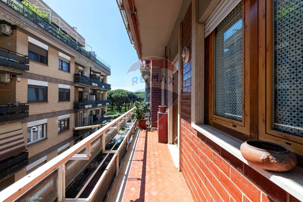 L'appartamento è dotato di un balcone che offre una piacevole vista sul verde circostante della pineta di Ostia.