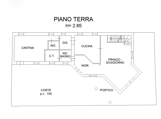 L'immobile è composto su tre piani dei quali due fuori terra ed uno interrato ed è composto: al piano interrato troviamo la cantina; piano terra: ingresso, pranzo-soggiorno, cucina, disimpegno/dispensa, cantina (tavernetta), w.c.,