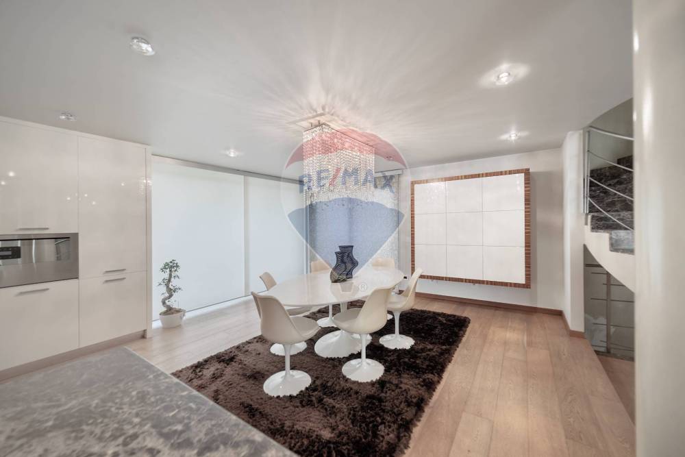 Al piano principale, il cuore della casa accoglie con un ampio soggiorno e una zona pranzo che dialoga armoniosamente con la cucina a vista, valorizzata da unelegante sopraelevazione. Una finestra angolare scenografica incornicia la luce naturale, rendendo ogni momento vissuto in questa zona unesperienza estetica. Le finiture sono di altissimo livello: parquet in rovere naturale, bagno di servizio rifinito in mosaico Bisazza oro e resina, infissi a tutta altezza in alluminio e portoncino blindato in vetro e acciaio.