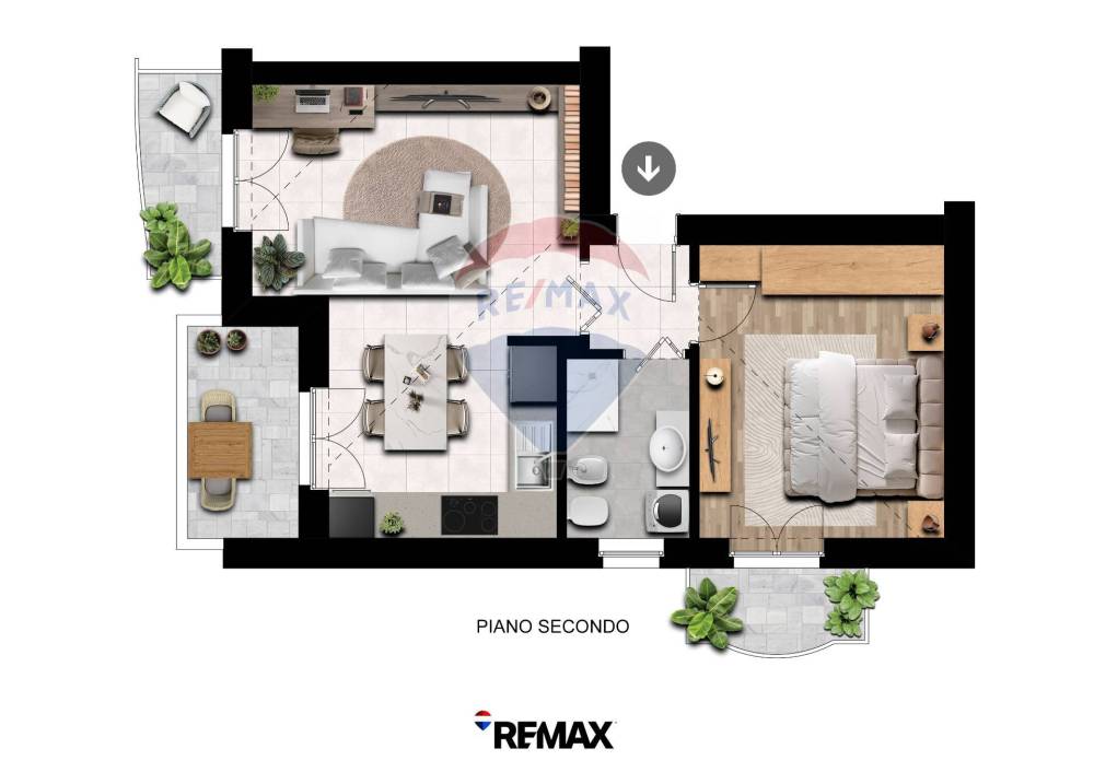 Labitazione, di circa 50 mq interni, accoglie un ambiente luminoso e curato nei dettagli: lingresso conduce alla zona giorno openspace con cucina a vista e accesso a due terrazzi con bella vista rilassante sui prati che circondano la casa, ideali anche per momenti di relax allaperto; la camera matrimoniale, riservata e accogliente, dispone di balcone privato, mentre il bagno finestrato è completo di sanitari sospesi e termo-arredo.