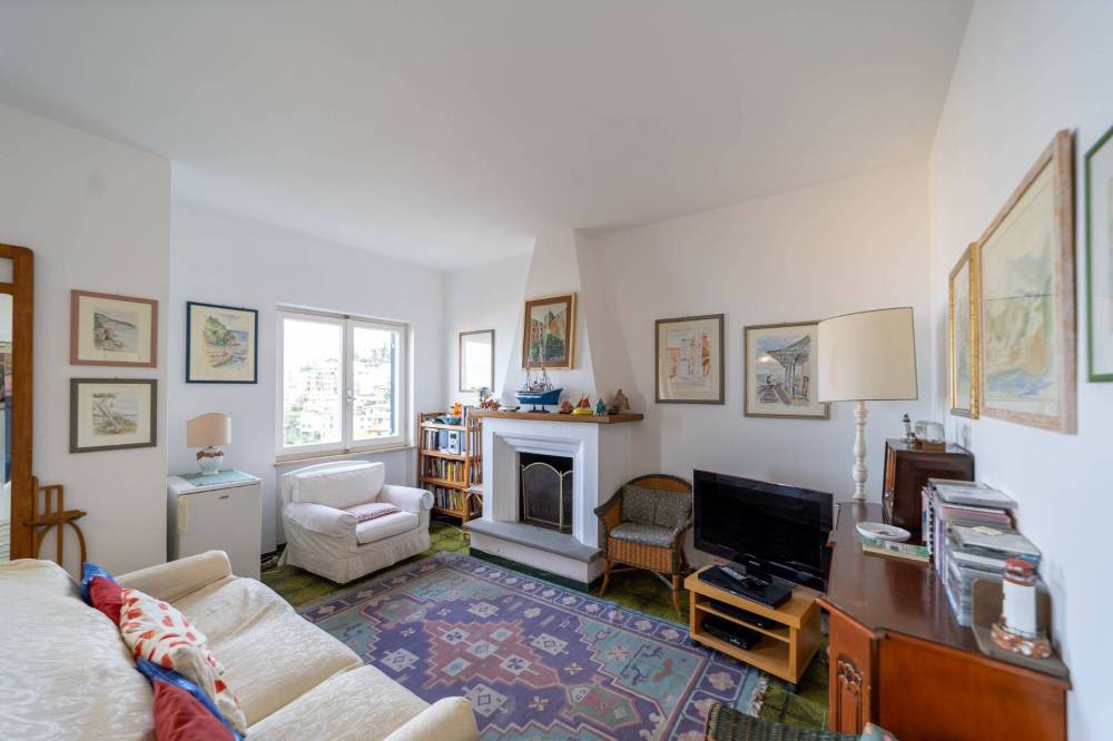 Lingresso conduce a un ampio soggiorno con camino, ambiente accogliente e ideale per momenti di relax e convivialità, che si apre su un ampio balcone vivibile, perfetto per godere del panorama mozzafiato sul mare. La cucina, separata e ben organizzata, dispone di un balcone di servizio.