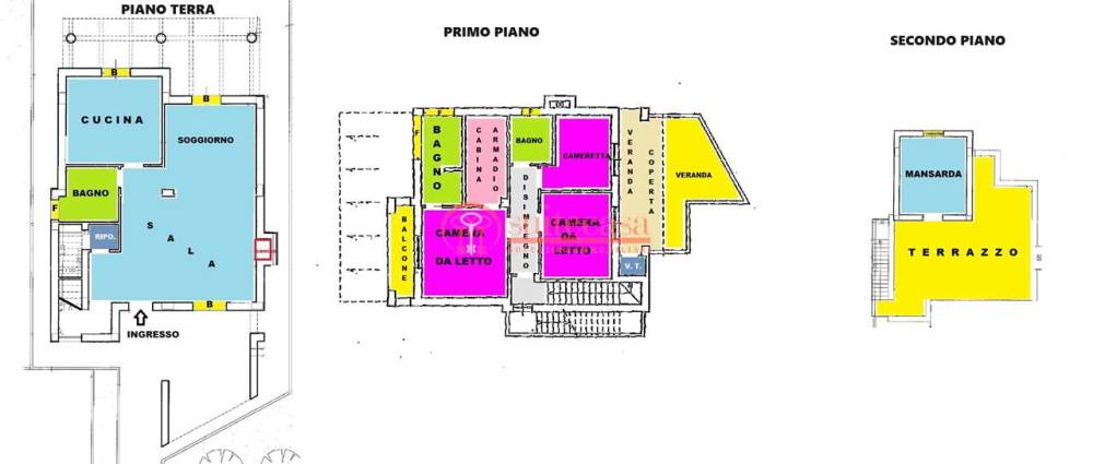 Piano terra: ingresso scenografico, ampio salone di rappresentanza, cucina abitabile