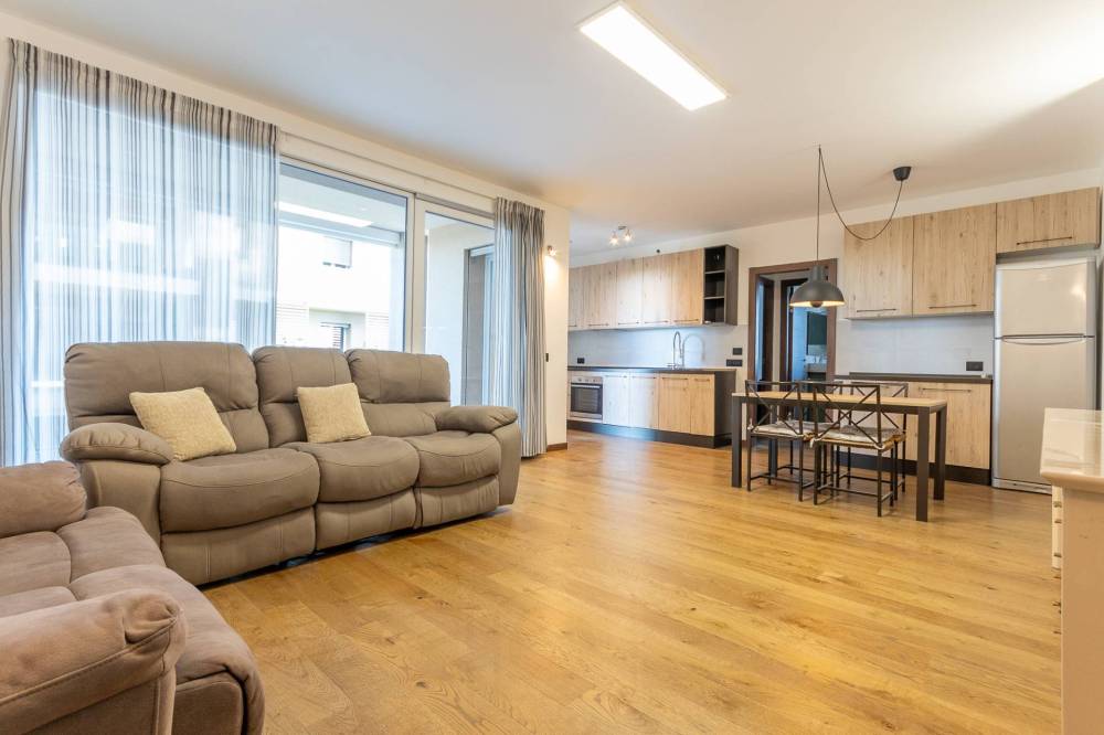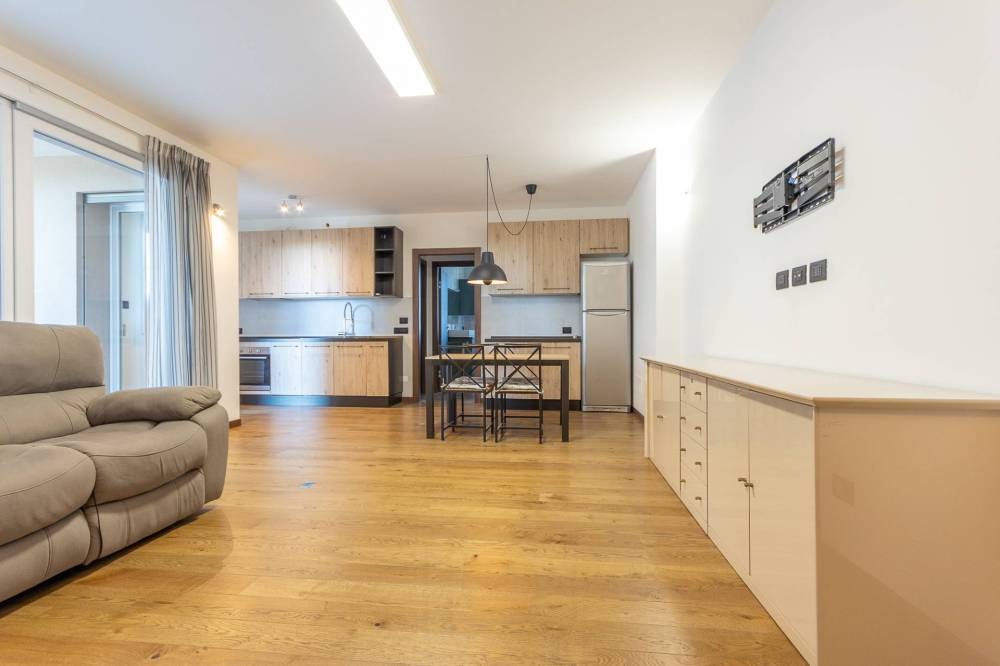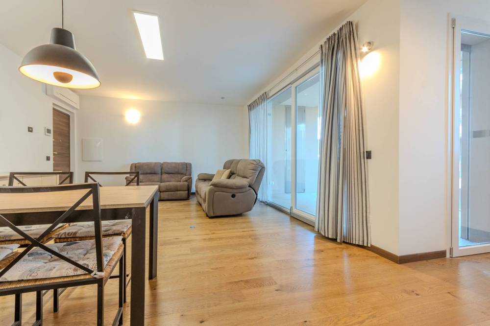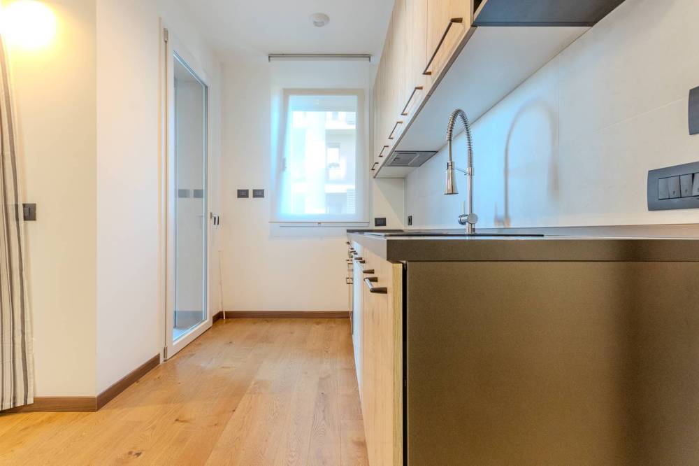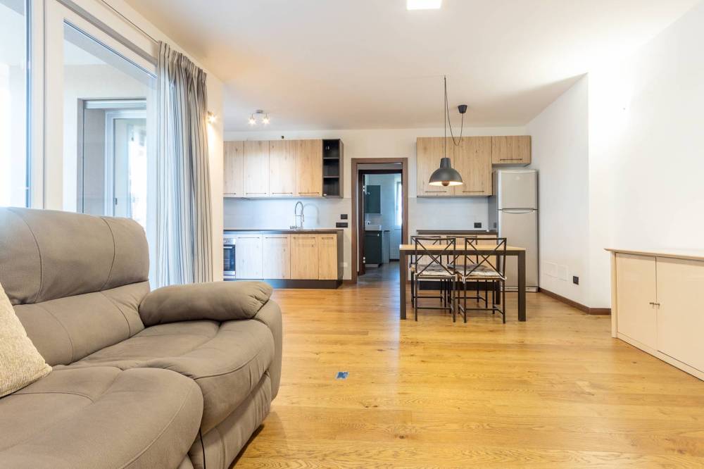 Lappartamento si apre su un luminoso soggiorno impreziosito da unampia vetrata a tutta parete, che regala una splendida luce naturale e affaccia su un terrazzo esposto a sud di 15 mq, ideale per momenti di relax e convivialità nelle giornate di sole.
