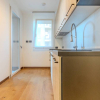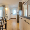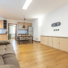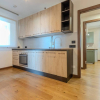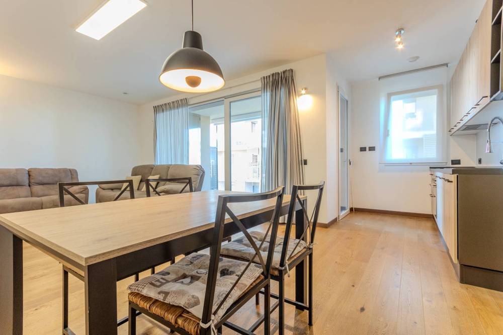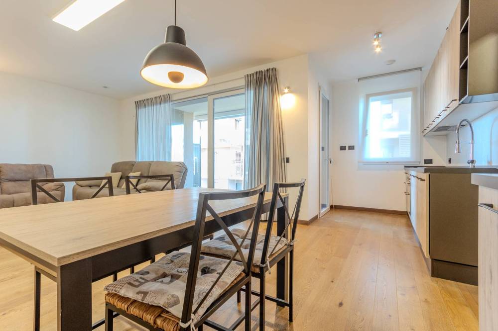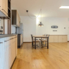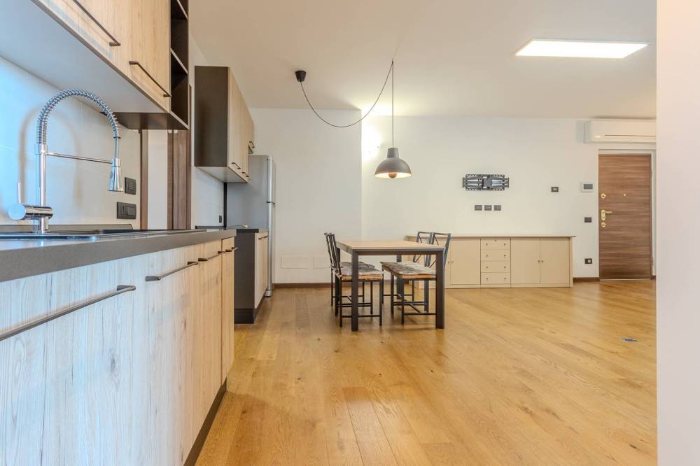 La zona giorno prosegue con unaccogliente area pranzo e un angolo cottura semi-nascosto, pensato per coniugare funzionalità ed estetica.