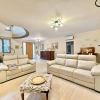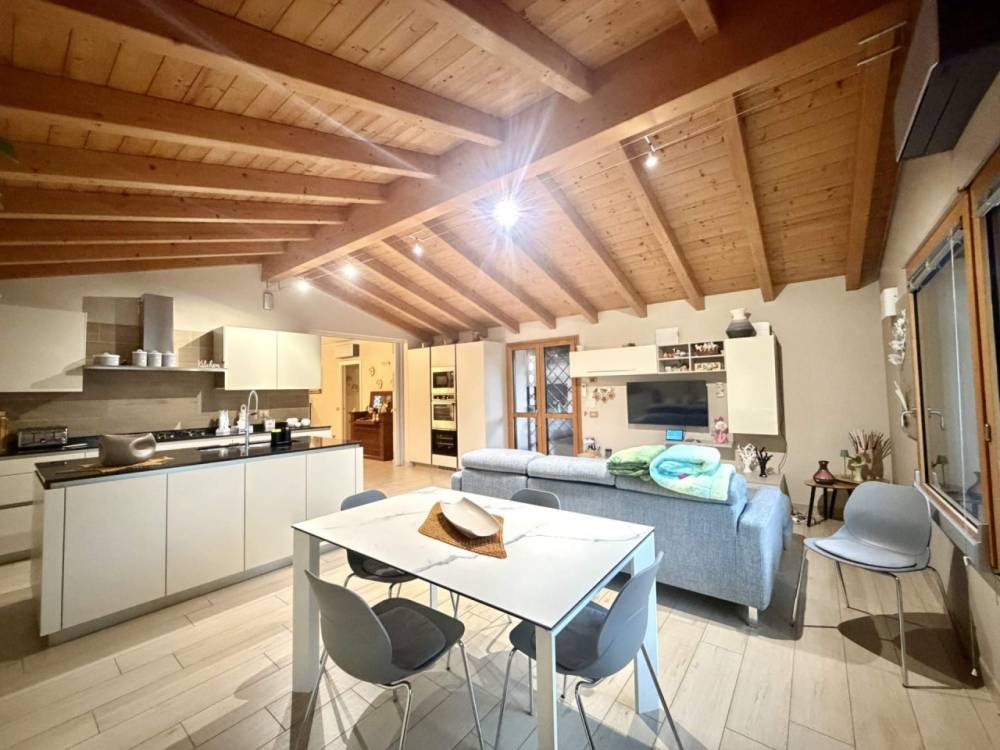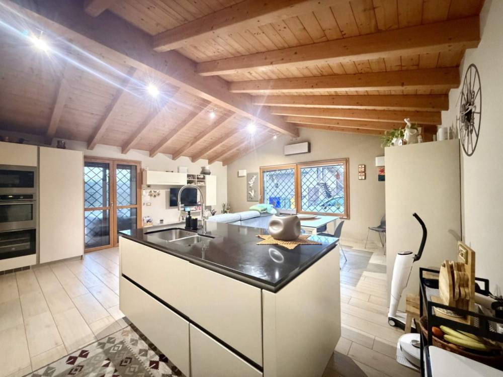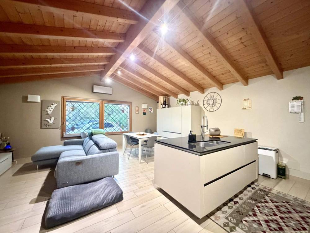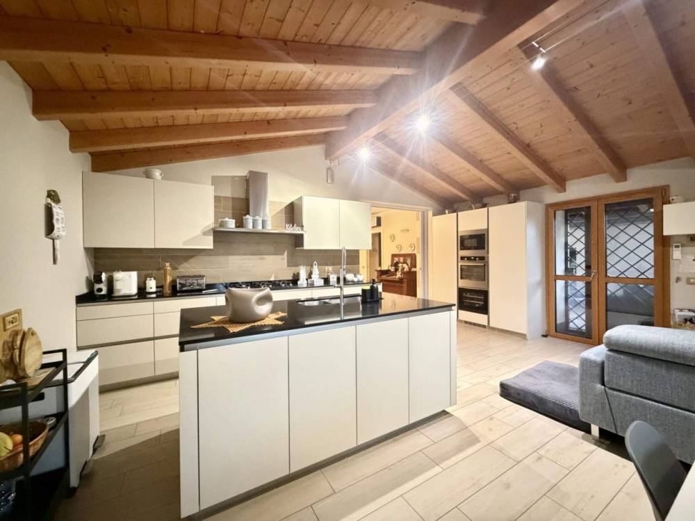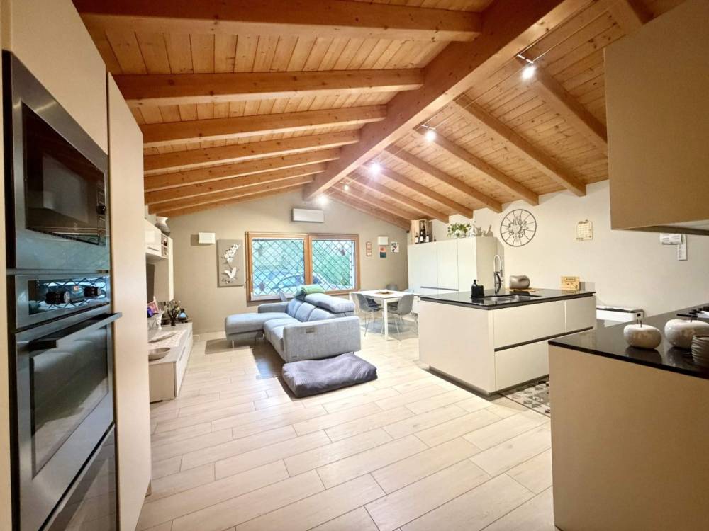 Dal soggiorno si arriva alla zona living, ampia e luminosa, con piano cucina a isola e angolo TV-relax.