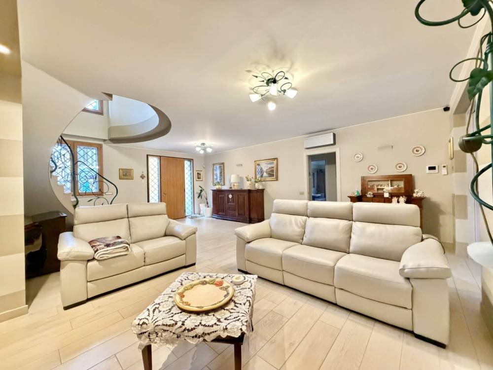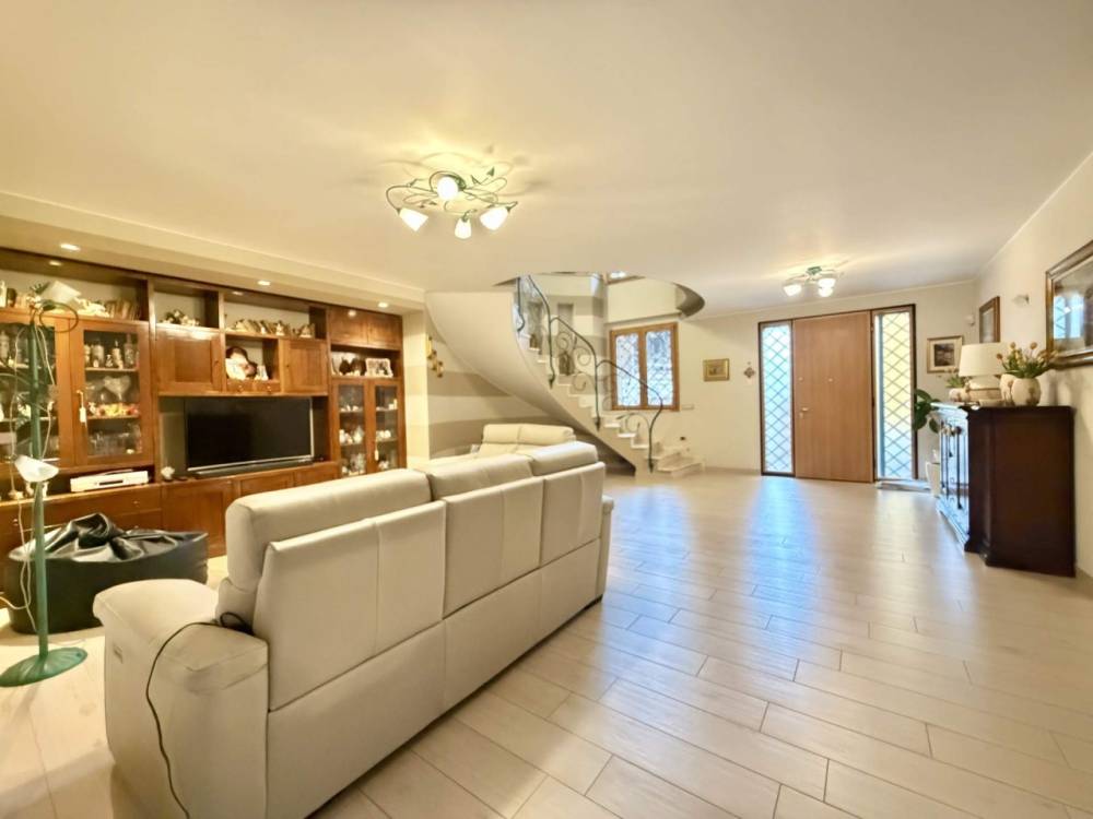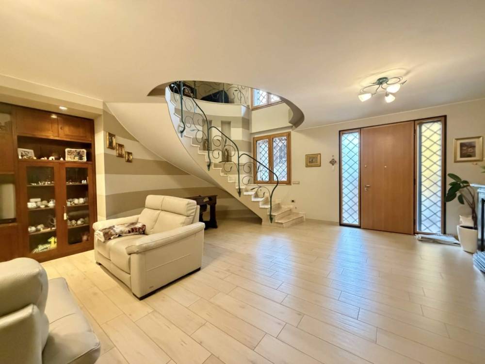 L’ingresso principale si apre nel grande soggiorno; il cuore della casa è rappresentato dalla scenografica scala interna, elemento architettonico di grande pregio, che unisce i due piani della casa.