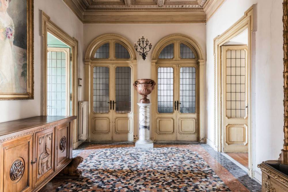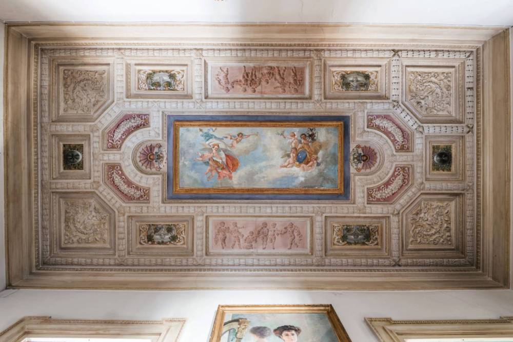 Gli spazi interni sono impreziositi da soffitti alti, alcuni affrescati e altri con raffinate cassettonature, boiserie depoca e finiture originali che conferiscono carattere e prestigio allimmobile.
