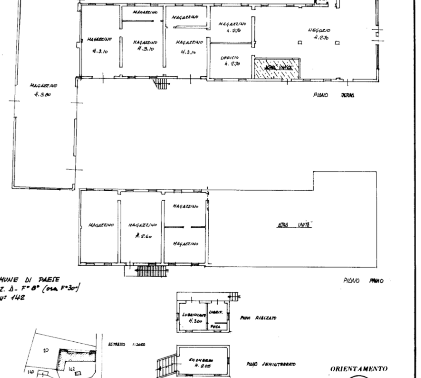 La prima costruzione è a due piani, composto da piano terra a negozio, ufficio e magazzini, piano primo parte a residenza e parte a magazzino, l'altra costruzione a capannone è solo ad un piano adibito a magazzino.