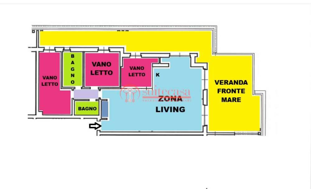 Ingresso, ampia zona living con angolo cottura, 3 camere da letto, 2 bagni, veranda a livello con vista mare