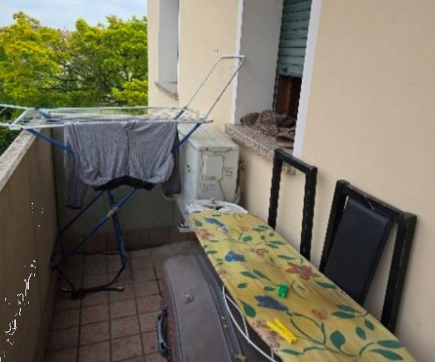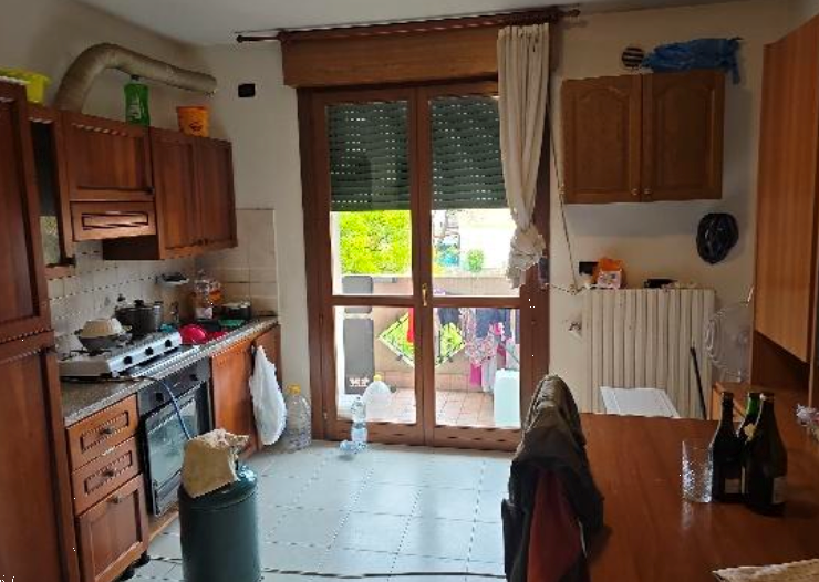 Appartamento al piano primo con annessa autorimessa situato a Veggiano (PD) in via Pedagni, costituito da un ingresso, sala da pranzo, zona cottura e soggiorno organizzato in ununico ambiente con un poggiolo, disimpegno, due camere da letto, un servizio igienico cieco, un bagno finestrato ed un poggiolo.
