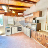 - Una cucina in muratura con tettoia in legno e ampia vetrata.