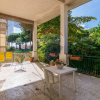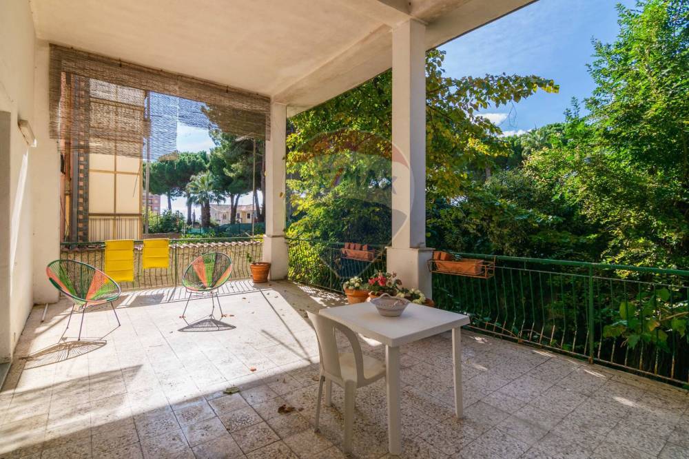 Dei due ingressi, uno di fronte all' altro, il primo a sinistra immette in un triplo salone, facilmente divisibile secondo le varie esigenze, comunicante con una ampia terrazza coperta di 3O metri quadri, ombreggiata d' Estate da due alberi, che d' inverno spogliano lasciando passare, gradevolmente i raggi del sole, e che si affaccia sul Parco della Villa comunale.