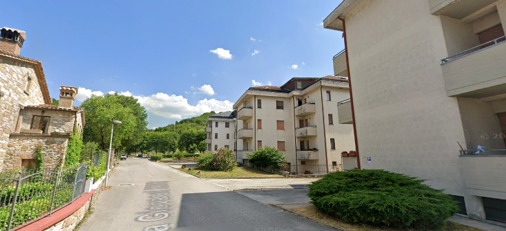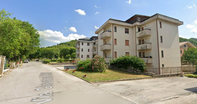 Appartamento a Frontone (PU) Via Papa Giovanni XXIII. Internamente L'unità si trova al piano primo di un edificio residenziale con ascensore, ha un'ingresso, locale soggiorno, piccola cucina, disimpegno, una camera da letto, bagno, e due terrazzi.