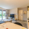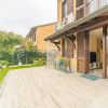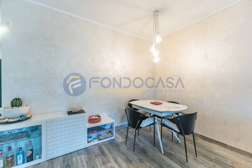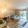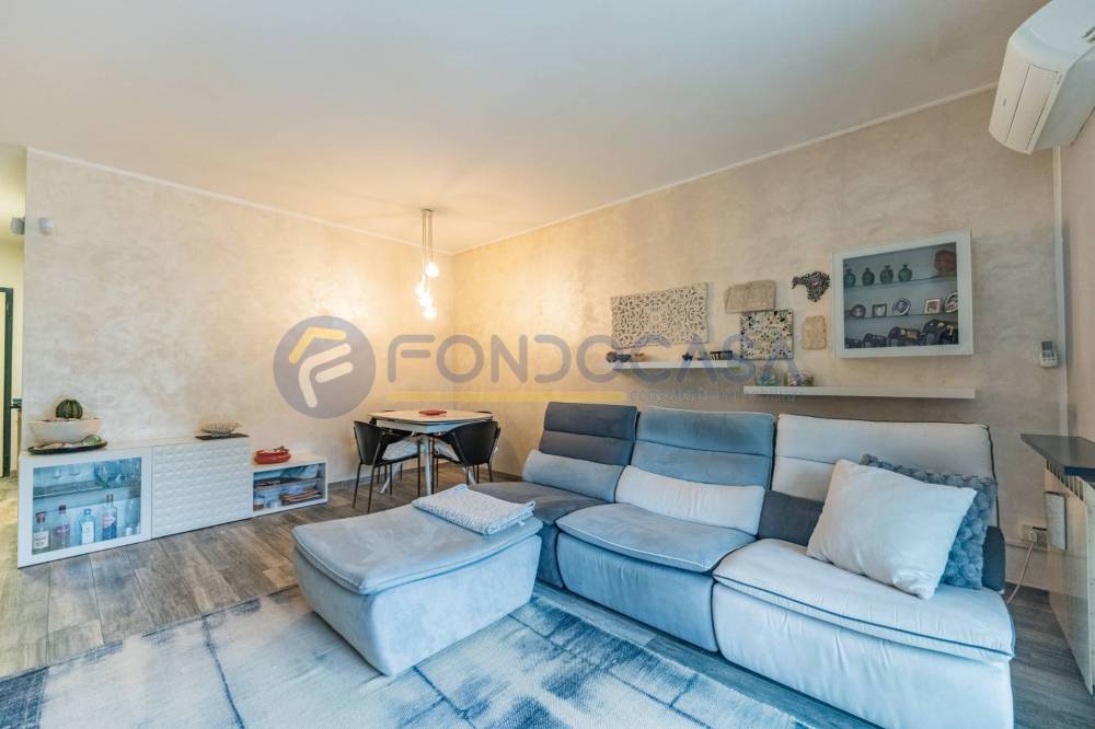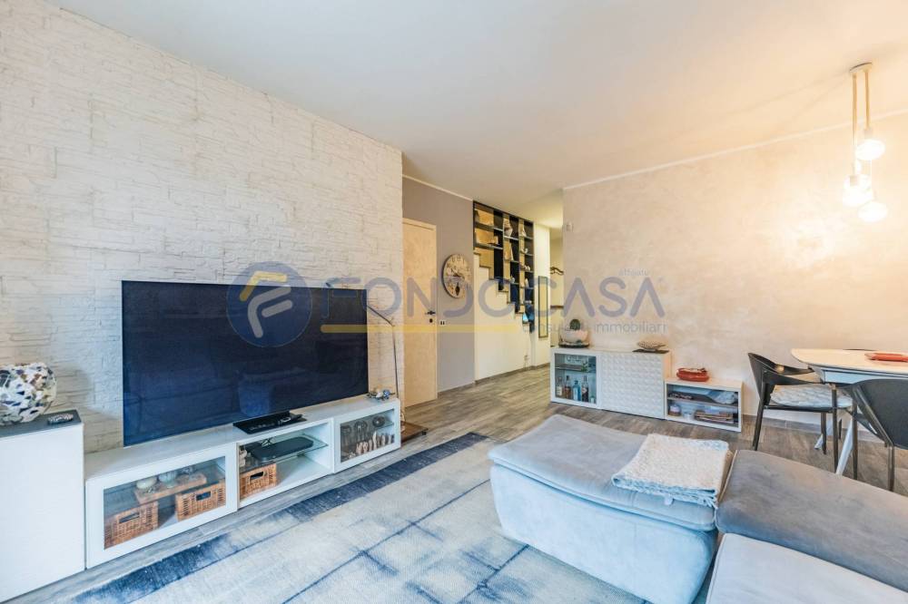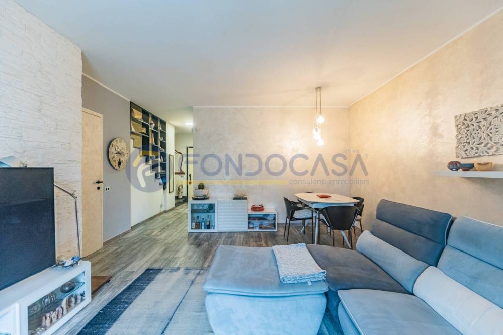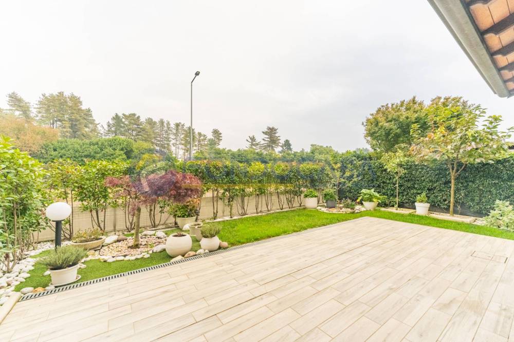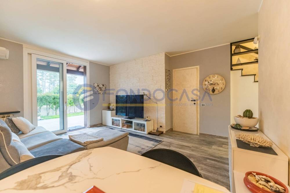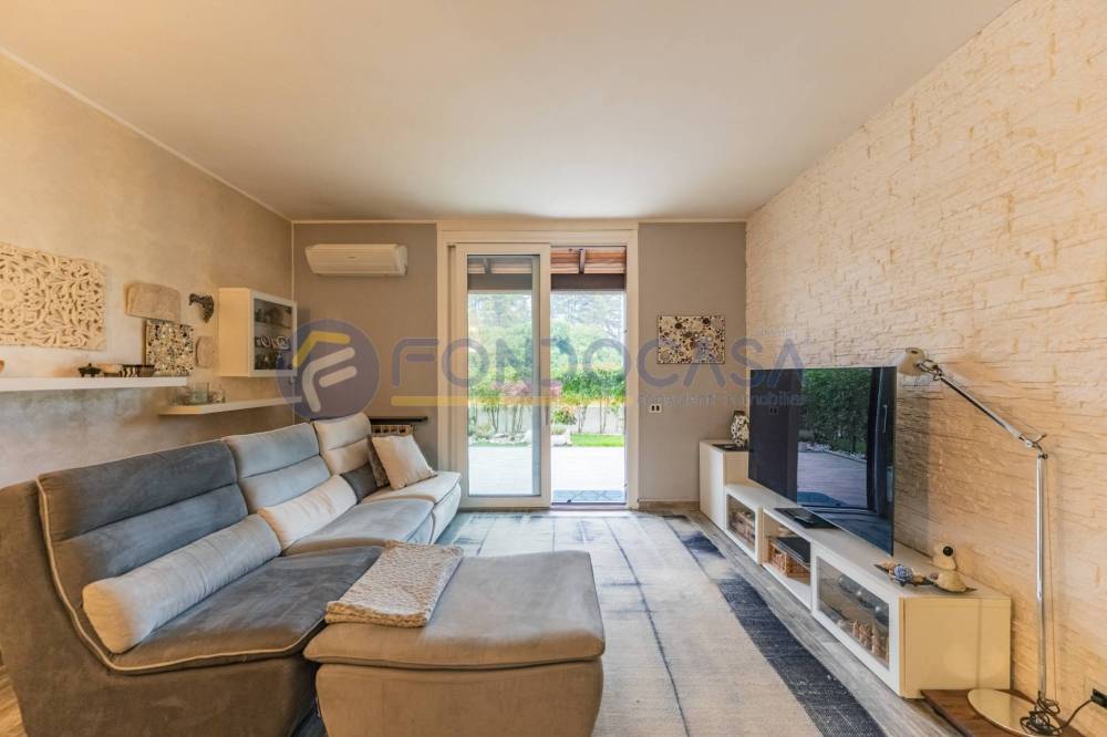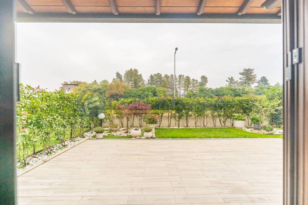 Un ampio e luminoso soggiorno, il vero cuore pulsante della casa. Qui, un'imponente vetrata scorrevole si apre come un sipario sul giardino privato: uno spazio esterno pavimentato, curatissimo e baciato dal sole, ideale per cene estive, momenti di relax o per vedere i bambini giocare in totale sicurezza.