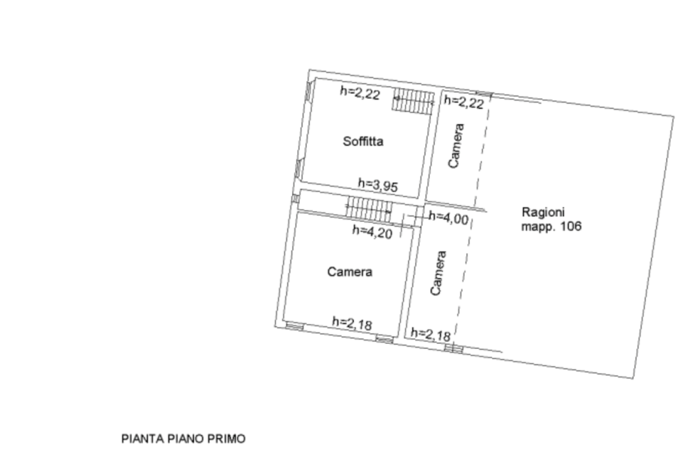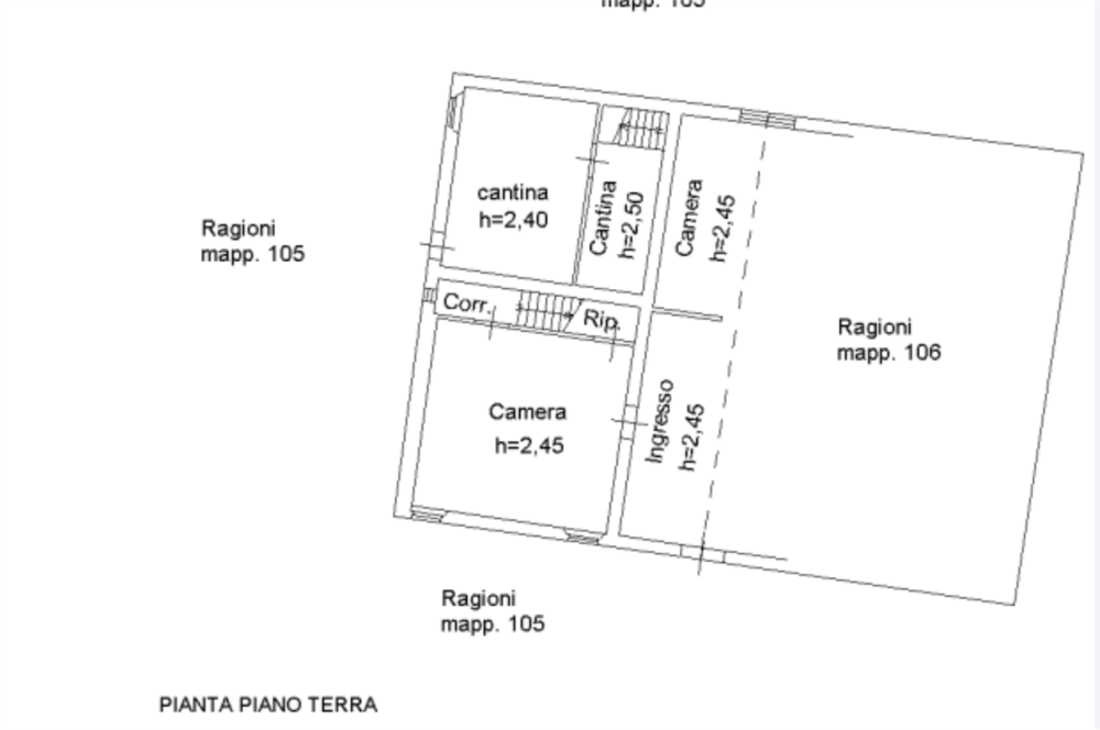 Al piano terra l'abitazione è composta da piano terra con due ingressi, due camere, due cantine, corridoio e ripostiglio. Al piano primo si trovano tre camere da letto e una soffitta. All'esterno è presente un ulteriore immobile accessorio ad uso ricovero attrezzi e stalla.