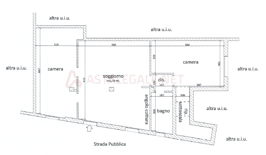 L'unità immobiliare, avente altezza interna pari a mt. 2,70 circa, è composta da soggiorno con angolo cottura, 2 camere, disimpegno, bagno e ripostiglio sottoscala.