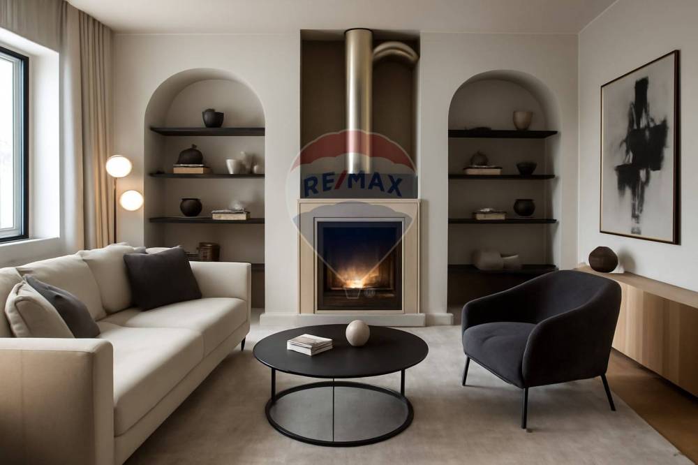 Al piano terra, un elegante ingresso introduce nellampio soggiorno, reso particolarmente accogliente dal camino con rivestimento in marmo e dalle ampie vetrate che donano luce naturale e accesso diretto al giardino privato.