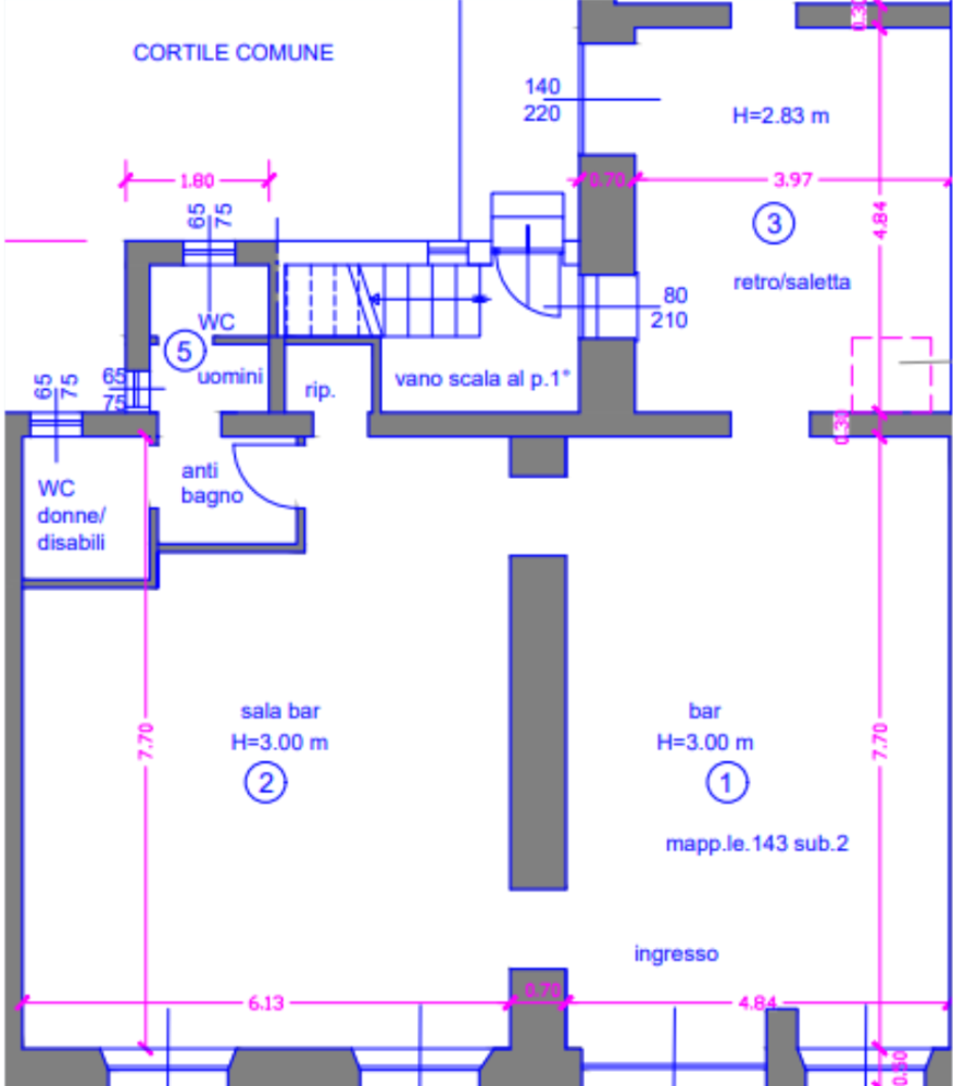 -bar/trattoria composto da quattro locali denominati bar, sala bar, retro con saletta trattoria e vano cucina oltre al servizio igienico composto da antibagno, wc uomini e wc donne/disabili e da un vano cantina;