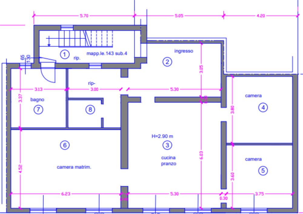 -appartamento situato al piano primo composto da ingresso, cucina-pranzo, tre camere, un ripostiglio ed un bagno con accesso dal pianerottolo di sbarco del vano scala al piano primo.