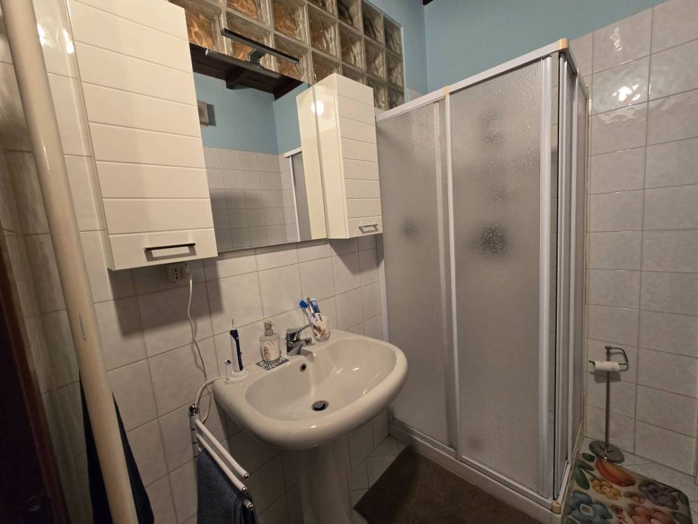 bagno con doccia e comoda armadiatura/ripostiglio.
