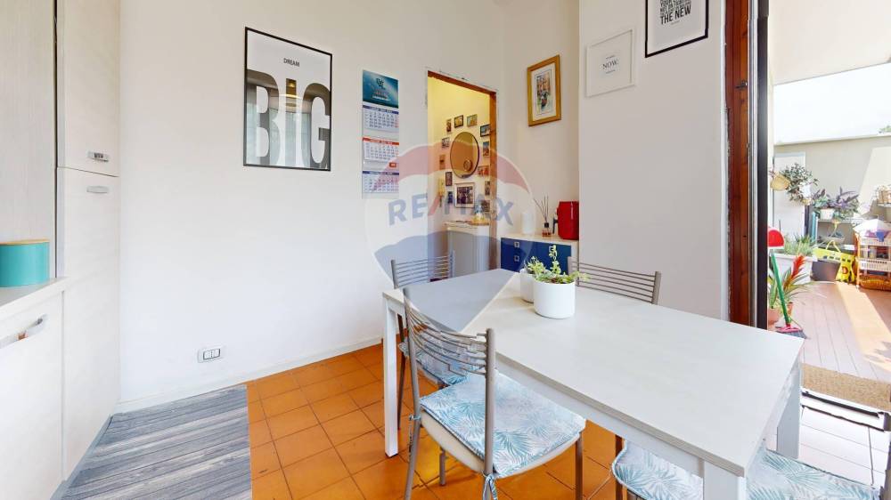 Alla destra della zona giorno troviamo il primo bagno, attualmente adibito a lavanderia, e la cucina abitabile con accesso al secondo balcone, perfetto per pranzi allaperto e sfoghi di servizio.