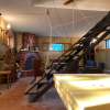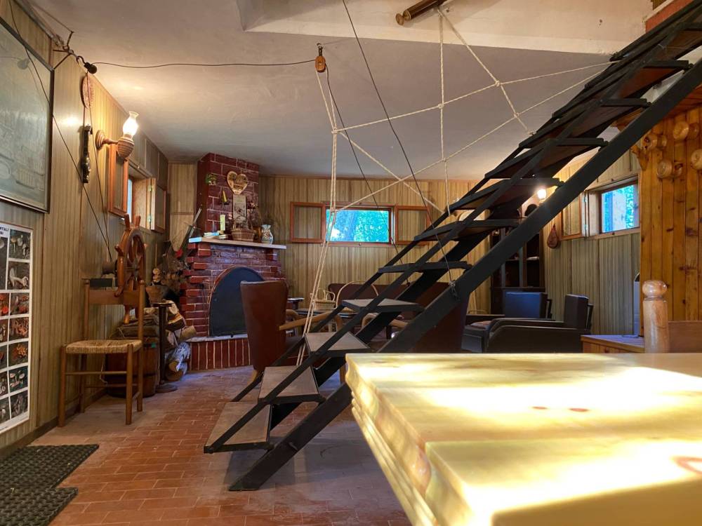 - Al piano terra troviamo un comodo soggiorno con camino a mattoni, un essenziale angolo cottura a vista, due funzionali ripostigli e la scala interna che ci porta al secondo livello. La particolarità della scala è quella di essere mobile, nel senso che può essere sollevata o abbassata alloccorrenza, e si attiva manualmente attraverso un meccanismo collegato ad un timone nautico.