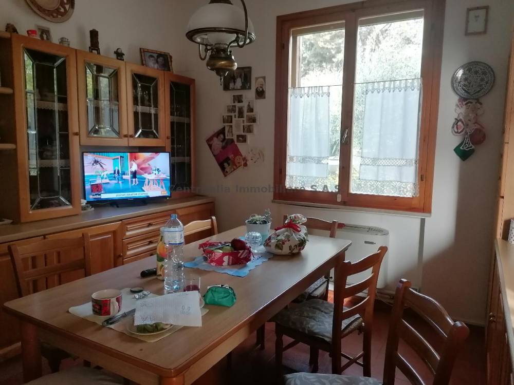 La casa è suddivisa in un appartamento principale di 160mq, formato da 3 camere, 2 bagni, cucina, sala. Presente una soffitta abitabile, che a sua volta dispone di 2 camere, un bagno, angolo cottura, e altre 2 spazi da cui si possono ricavare 2 due stanze. A completare il tutto, c'è un piano seminterrato con 2 garage, cucina, bagno e cantina. Riguardo l'esterno, la casa è circondata da 1000mq di scoperto, in cui sono presenti 35 olivi.