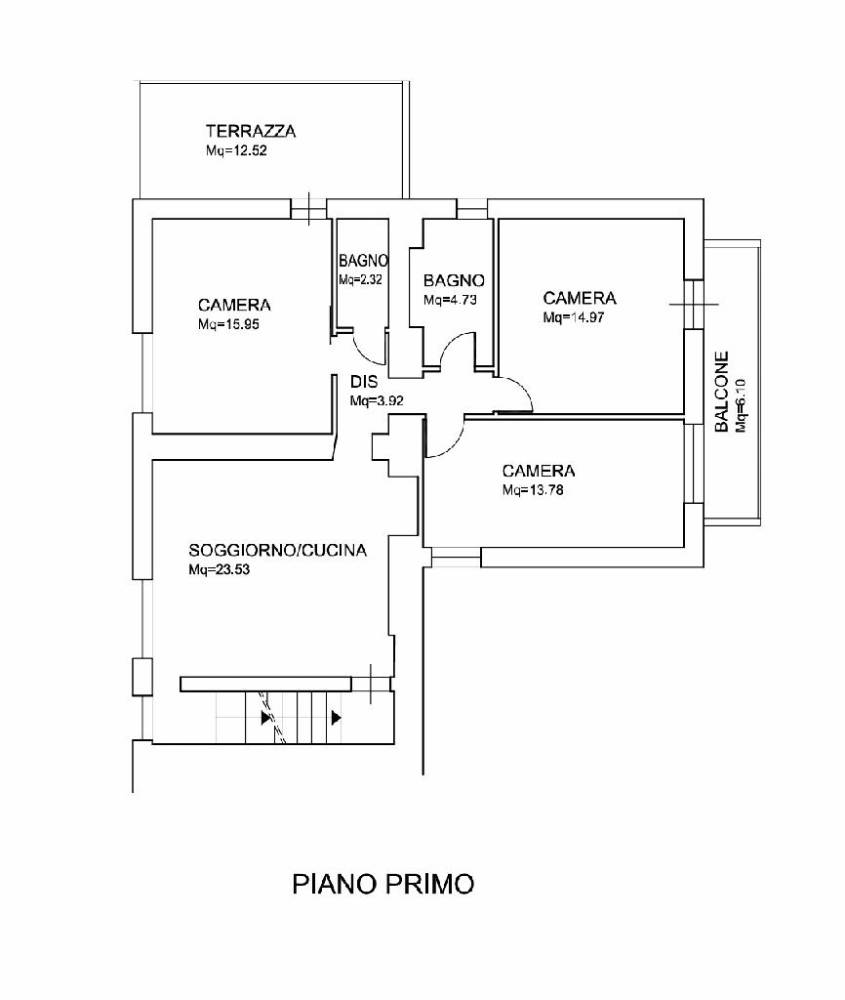 L'abitazione- al piano 1 e ultimo con scala indipendente- si divide tra la zona giorno, le tre ampie camere e i due bagni, ed è completata dall'ampio terrazzo abitabile di mq.13 e da un balcone di mq.6.