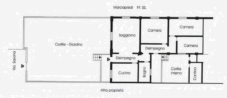 L'immobile è dotato di una corte esterna di accesso, a lato est, utilizzata a giardino da cui si accede all'abitazione a piano rialzato, composta da un ingresso su disimpegno, una cucina, un grande soggiorno - pranzo, piccolo bagno, corridoio che oltre a servire due camere da letto e uno studio, ha accesso su un cortile interno dove a lato ovest c'è un locale a deposito e un locale tecnico dove è ubicata la caldaia a gas per il riscaldamento autonomo e l'acqua calda sanitaria.