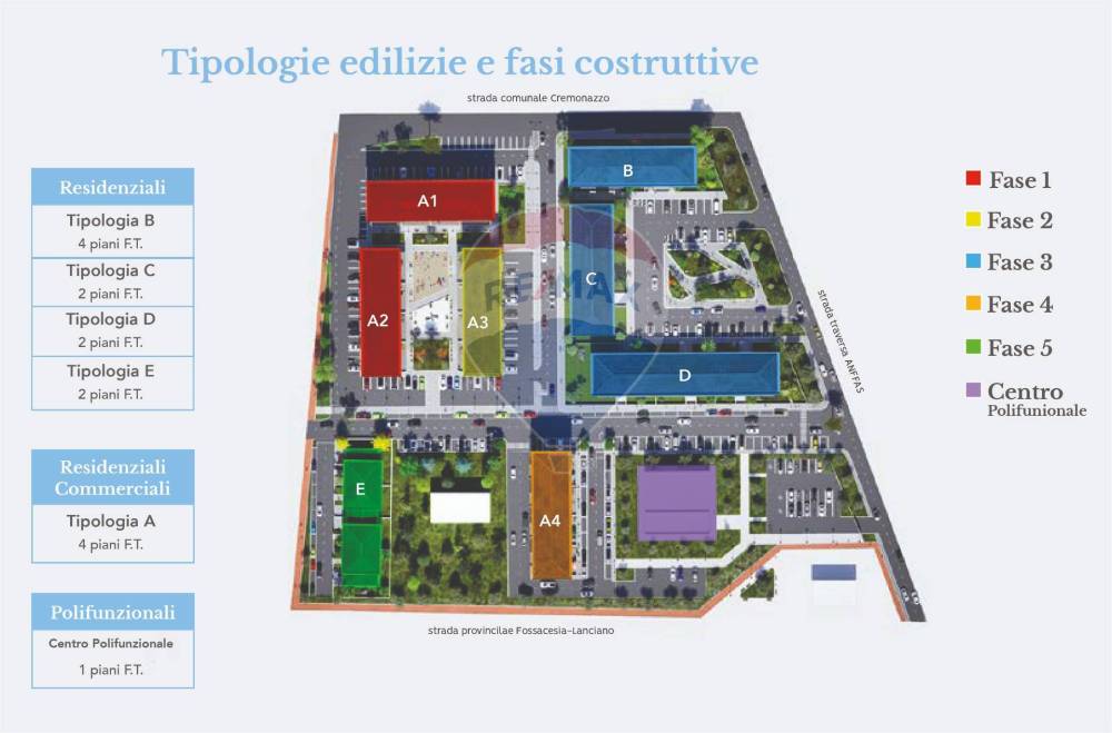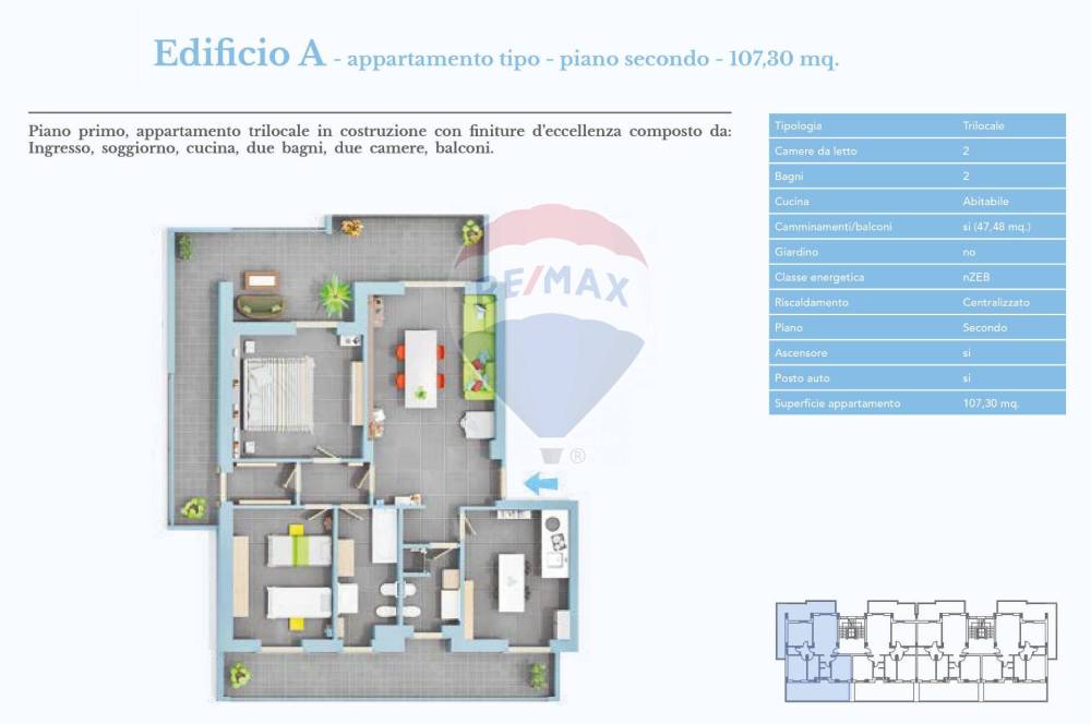 79,62 mq ingresso/soggiorno/angolo cottura, 2 camere, 1 bagno, 1 ripostiglio, 2 balconi da 28,03 mq
