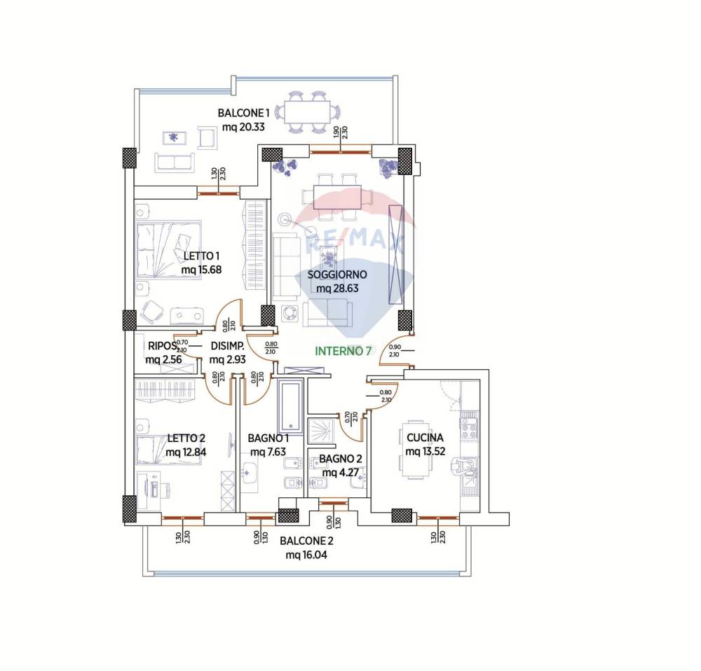 79,62 mq ingresso/soggiorno/angolo cottura, 2 camere, 1 bagno, 1 ripostiglio, 2 balconi da 28,03 mq