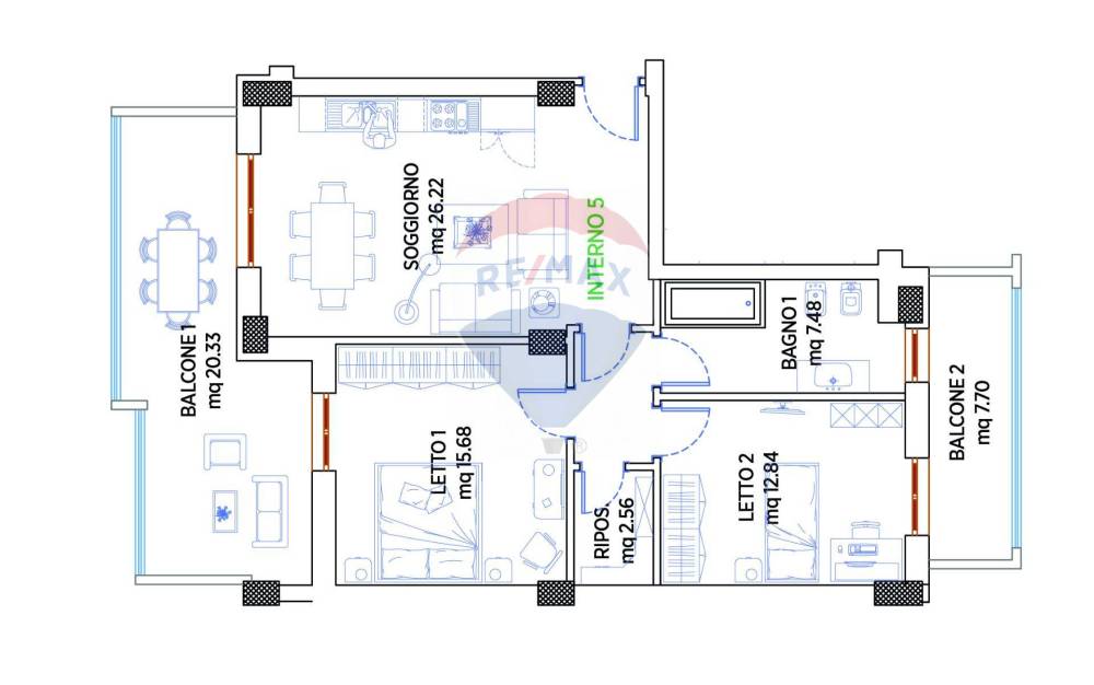 103,75 mq ingresso/soggiorno, cucina abitabile, 2 camere, 2 bagni, 2 balconi di 36,37 mq