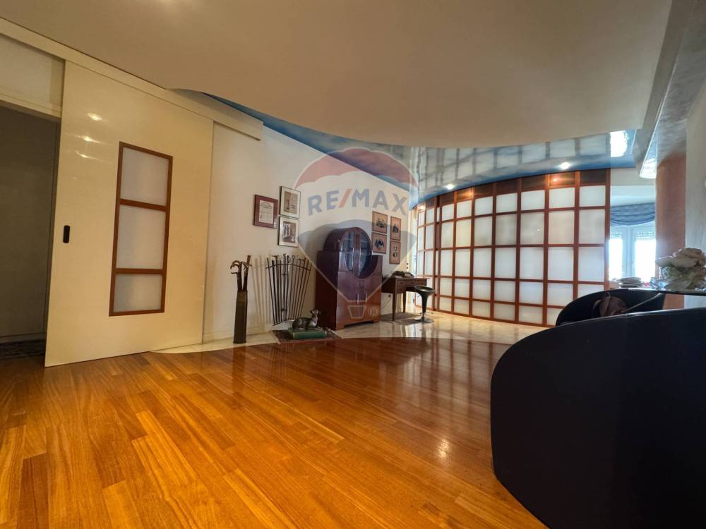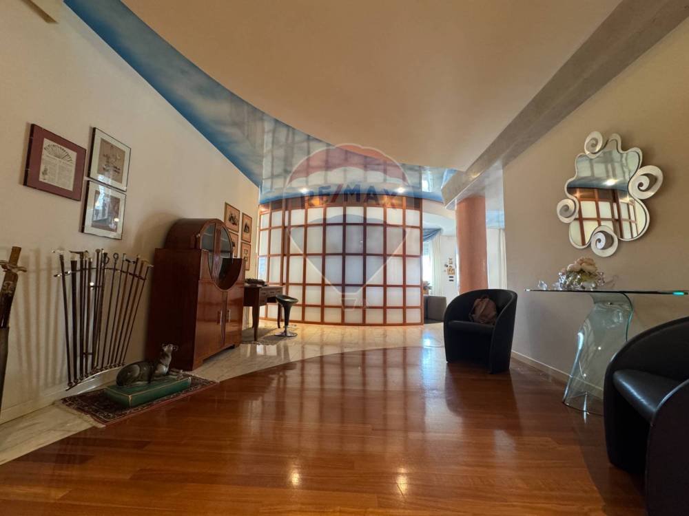 Dalla porta d'ingresso un luminoso open-space accoglie la zona living, di qui una caratteristica parete scorrevole apre lo scenario ad una prestigiosa cucina di design di ultima generazione per proseguire verso un ampio e luminoso salone dalle grandi vetrate che affacciano sul corso principale della città.