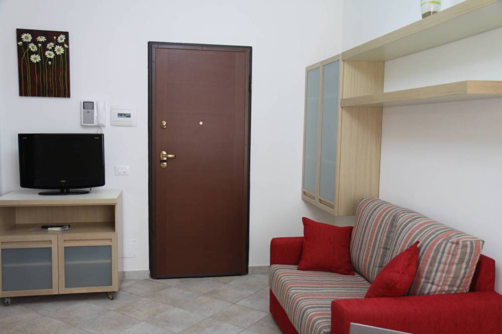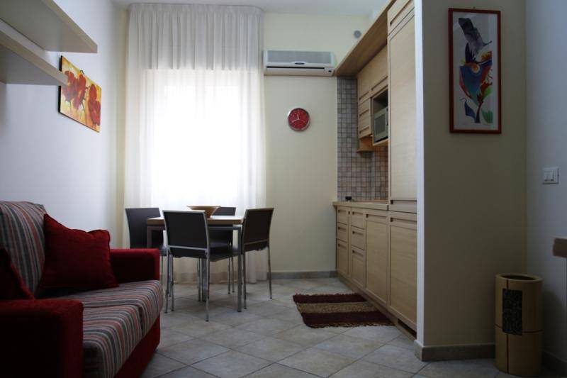 Ingresso su grande ambiente con tavolo e angolo cottura, divano letto, un wc con doccia, camera da Letto e ripostiglio. Stabile fornito di ascensore. Risponde ai più moderni standard abitativi e al rispetto delle più recenti normative in fatto di sicurezza e efficienza energetica. L'appartamento è dotato di videocitofono, tv-lcd con digitale terrestre, predisposizione per canali satellitari, pompe di calore, forno microonde-combinato, frigorifero e freezer, scaldabagno, lavatrice, asse e ferro da stiro, stendibiancheria, set pulizie e scala. Nella zona living troverete un tavolo e relative sedie, una comoda cucina ed altre suppellettili come quadri, vasi etc.