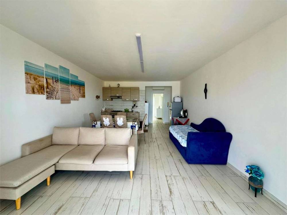 Ampio salone con angolo cottura, luminoso e ben distribuito, dotato di balcone con affaccio diretto sul mare, ideale per godersi tramonti e momenti di relax.