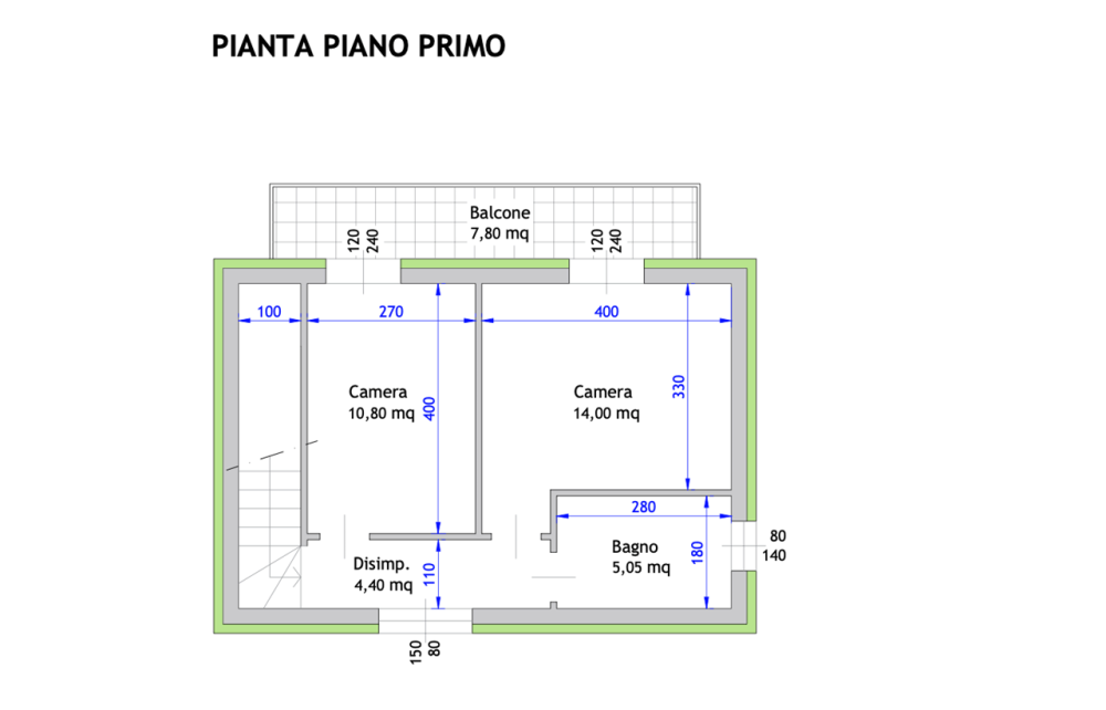 Al piano primo si trova la zona notte: un disimpegno, due camere da letto una matrimoniale e una singola e il bagno principale di circa 5 mq.