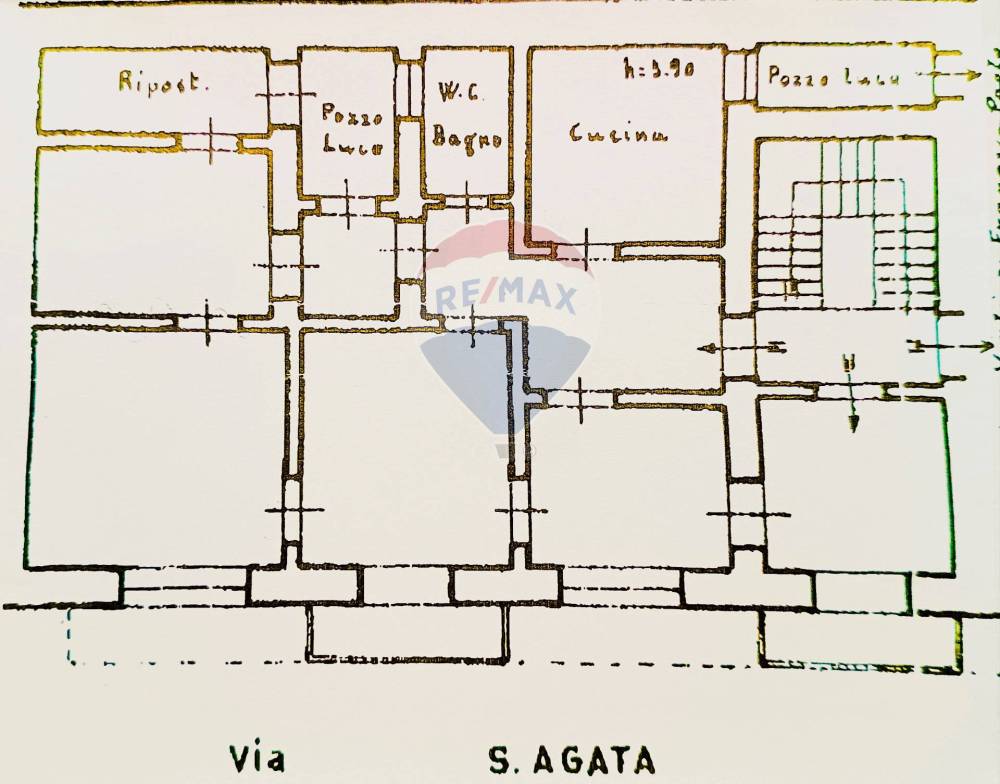Situato al primo piano -con ascensore- l'immobile si apre su un ampio salone con finestra e comunicante con altre due camere entrambi con balcone sulla Via SantAgata. A seguire un disimpegno porta al bagno ed a quella che in origine era la grande cucina, sul retro. Infine segue un altro disimpegno che conduce ad un altro ampio salone con parquet e finestra ed al ripostiglio. Tre vani con accesso ai cavedi, quattro con due grandi finestre e due balconi in muratura e ferro battuto in linea con lo stile della facciata, tutti sulla Via SantAgata. Le camere conservano perfettamente visibili i pavimenti in cementine e graniglie geometriche. Le grandi porte interne sono ancora quelle originali in legno smaltato a due battenti.