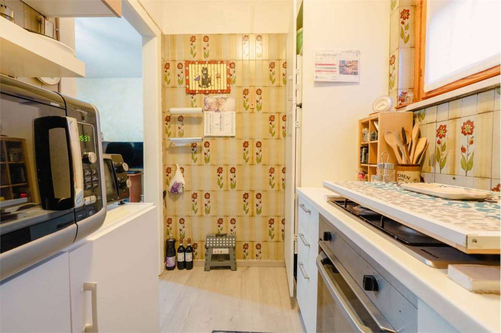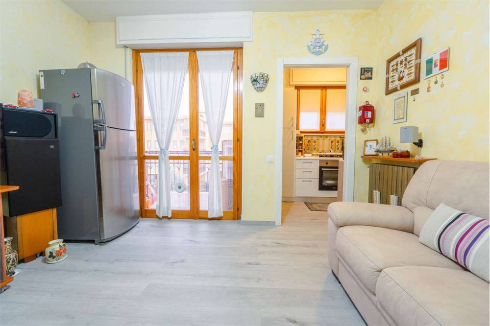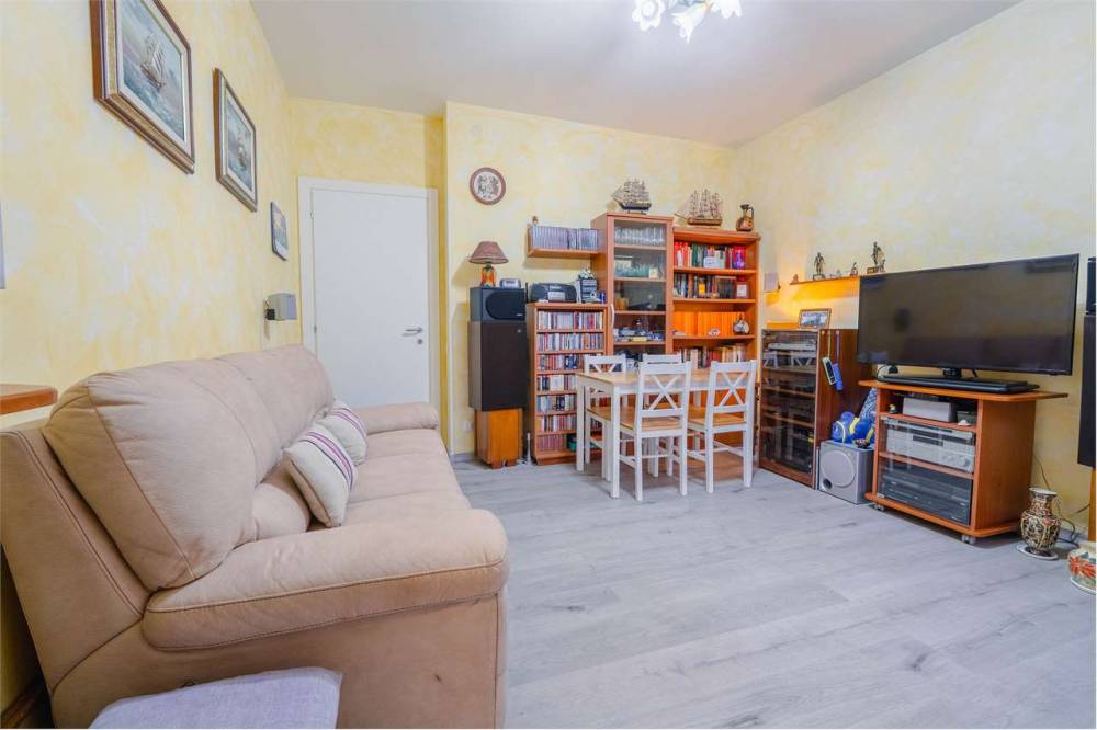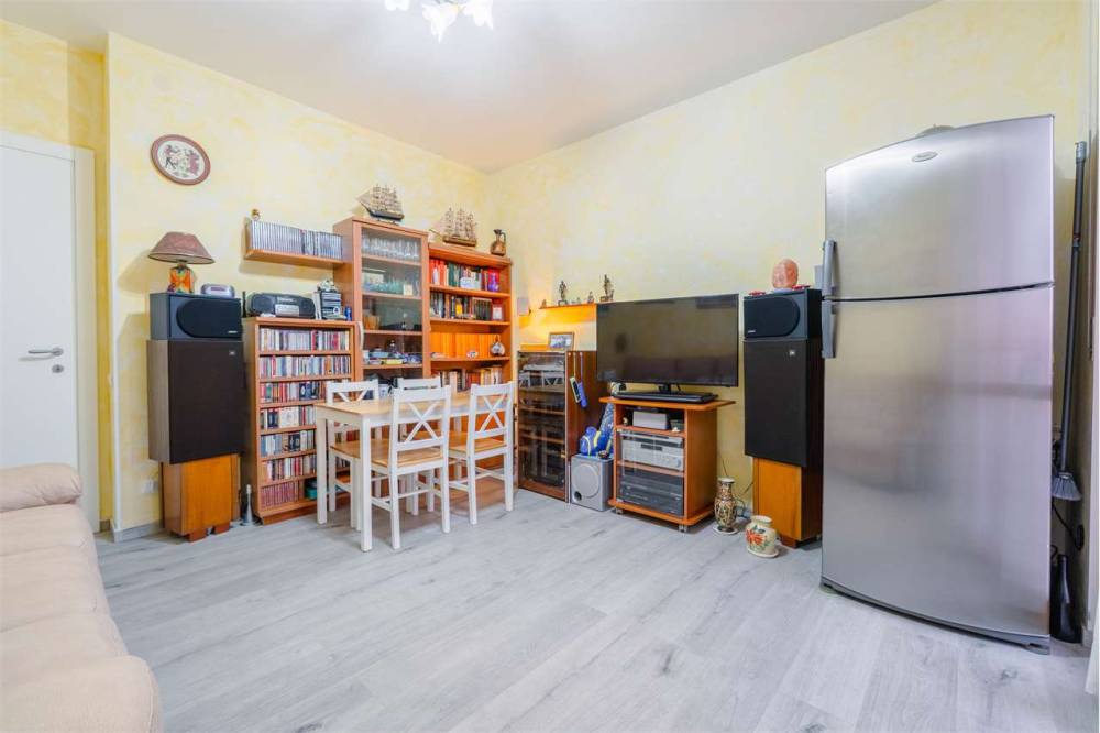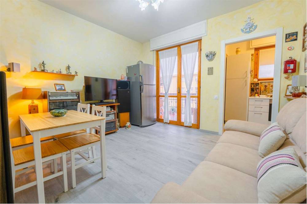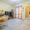 La disposizione interna comprende un ingresso che conduce al soggiorno con cucinino, una camera da letto e un bagno. A completare la proprietà è presente un comodo box auto al piano terra, elemento sempre molto ricercato nella zona.
