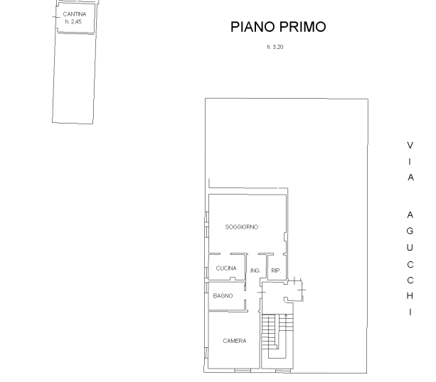 Abitazione posta al rimo piano di un edificio residenziale ; composta da ingresso, soggiorno, cucina, camera, bagno e ripostiglio, con annessi un vano cantina pertinenziale in corpo separato al piano terra e un posto auto scoperto anch'esso al piano terra.