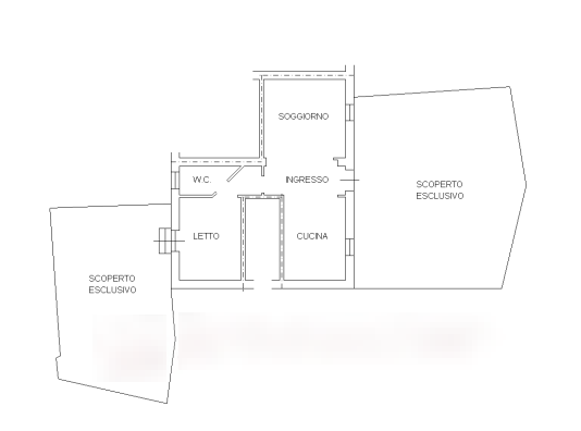 L'immobile è posto al piano terra ed è composto da ingresso, soggiorno, cucina, disimpegno, bagno, camera, scoperto esclusivo e ripostiglio.