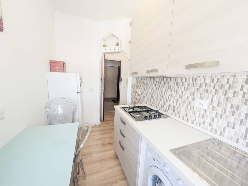 Lingresso accoglie in un ambiente funzionale che distribuisce gli spazi interni: una camera matrimoniale ampia, una cucina vivibile, un bagno finestrato completo di box doccia e un comodo armadio a muro.